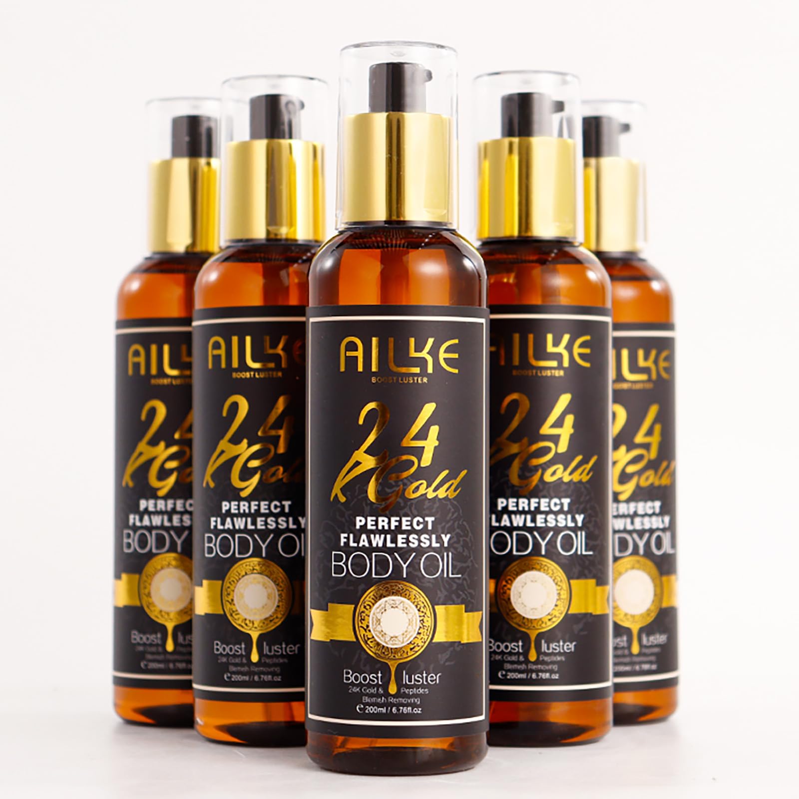 DESCRIPTION DU PRODUIT DESCRIPTION DU PRODUIT Experience luxurious skincare with AILKE 24k Gold Perfect Flawlessly Body Oil, a premium 200ml body treatment designed for comprehensive skin enhancement. This nourishing formula combines various plant essential oils to deliver multiple benefits: it helps smooth skin texture, provides deep nourishment, and assists in evening out skin tone. The lightweight oil absorbs easily into the skin through a simple three-step application process: dispense onto your palm, apply evenly across body and legs, then gently massage until absorbed. Suitable for all skin types, this versatile body oil works for both men and women. The formula helps maintain skin moisture while working to improve overall skin appearance. AVERTISSEMENT DE SÉCURITÉ This product is for external use only and all skin types are different, so for best results, please follow the instructions below. First use-test on a small part of the skin. If you have an allergic reaction allergy, please stop using it. If any reaction occurs, stop using it immediately. Do not use if you are sensitive to any ingredients. Avoid contact with eyes. If contact occurs, rinse thoroughly with water. This product is not intended to diagnose, alleviate, treat, cure or prevent any diseasePREMIUM PACKAGING: Elegant black and gold bottle design with a convenient pump dispenser for precise amount control. EASY APPLICATION: Simple 3-step process - dispense onto palm, apply evenly over body and legs, then gently massage until absorbed. VERSATILE USE: Suitable for all skin types and can be used by both men and women as a daily body moisturiser. TRIPLE ACTION: Effectively smooths, nourishes, and helps lighten spots on the skin through regular application. LUXURIOUS FORMULA: Natural plant-based body oil enriched with 24k gold elements for a premium skincare experience, comes in a generous 200ml bottle.AILKE 24k Gold Perfect Flawlessly Body Oil, Natural Plant Oil For Women, Skin Moisturizer, Lighten Spots, Smoothing, Nourishing, 200ml (Pack of 5)DESCRIPTION DU PRODUIT DESCRIPTION DU PRODUIT Experience luxurious skincare with AILKE 24k Gold Perfect Flawlessly Body Oil, a premium 200ml body treatment designed for comprehensive skin enhancement. This nourishing formula combines various plant essential oils to deliver multiple benefits: it helps smooth skin texture, provides deep nourishment, and assists in evening out skin tone. The lightweight oil absorbs easily into the skin through a simple three-step application process: dispense onto your palm, apply evenly across body and legs, then gently massage until absorbed. Suitable for all skin types, this versatile body oil works for both men and women. The formula helps maintain skin moisture while working to improve overall skin appearance. AVERTISSEMENT DE SÉCURITÉ This product is for external use only and all skin types are different, so for best results, please follow the instructions below. First use-test on a small part of the skin. If you have an allergic reaction allergy, please stop using it. If any reaction occurs, stop using it immediately. Do not use if you are sensitive to any ingredients. Avoid contact with eyes. If contact occurs, rinse thoroughly with water. This product is not intended to diagnose, alleviate, treat, cure or prevent any diseasePREMIUM PACKAGING: Elegant black and gold bottle design with a convenient pump dispenser for precise amount control. EASY APPLICATION: Simple 3-step process - dispense onto palm, apply evenly over body and legs, then gently massage until absorbed. VERSATILE USE: Suitable for all skin types and can be used by both men and women as a daily body moisturiser. TRIPLE ACTION: Effectively smooths, nourishes, and helps lighten spots on the skin through regular application. LUXURIOUS FORMULA: Natural plant-based body oil enriched with 24k gold elements for a premium skincare experience, comes in a generous 200ml bottle.