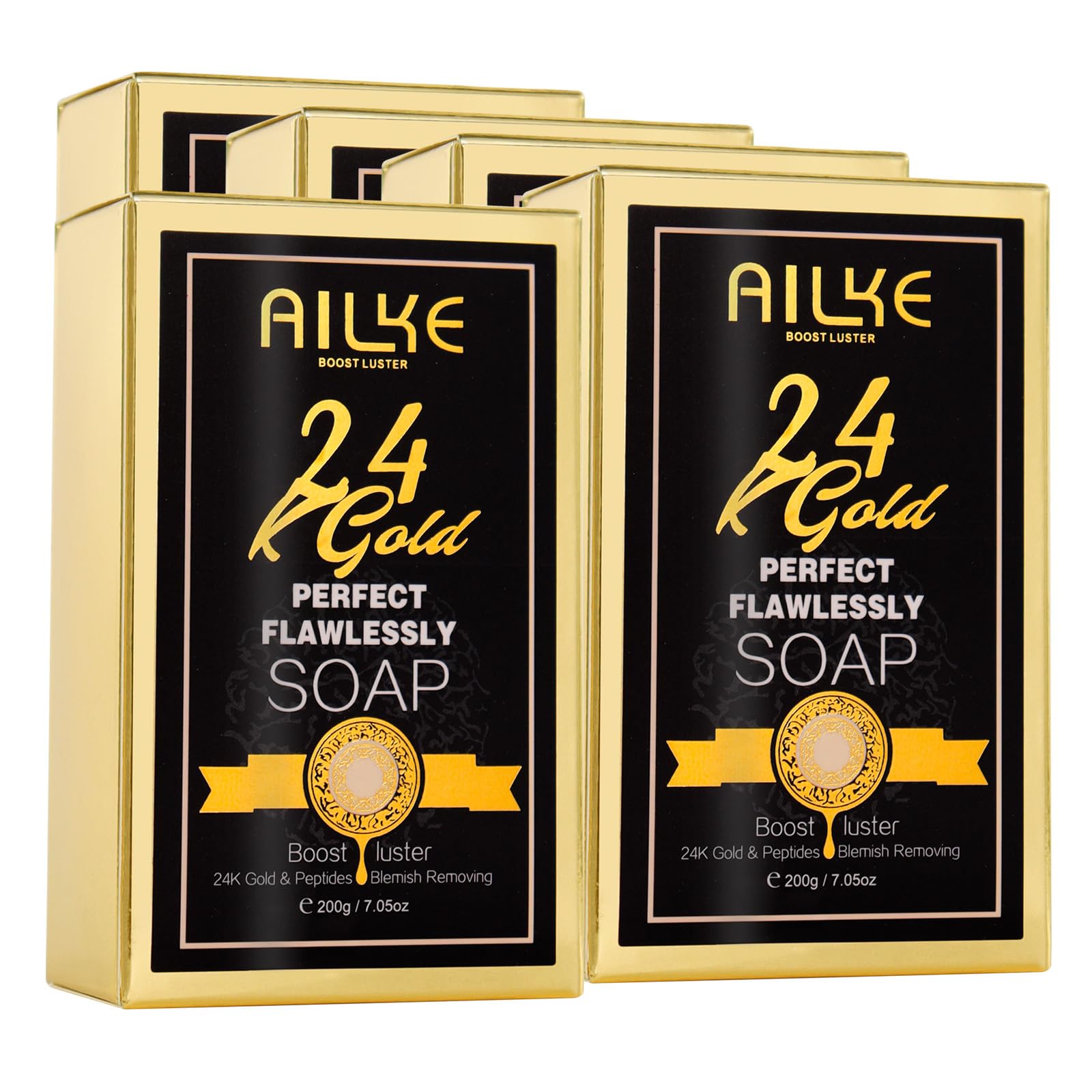 Discover the luxurious AILKE 24K Perfect Flawlessly Whitening Soap, a premium beauty solution designed to enhance your skincare routine. This 200g soap bar is enriched with powerful ingredients including turmeric, niacinamide, and vitamin C to deliver comprehensive skin benefits. The formula works to moisturise and gently cleanse while helping to reduce the appearance of acne, blackheads, and dark spots. Perfect for those seeking a more even and radiant complexion, this soap aids in improving skin elasticity and provides deep cleansing action. VEILIGHEIDSWAARSCHUWING For external use only. Avoid direct contact with eyes. Discontinue use if irritation or redness occurs. Keep out of reach of childrenGENEROUS SIZE: 200g bar soap presented in an elegant gold-accented package. MOISTURISING ACTION: Provides essential hydration while cleansing for soft, nourished skin. SKIN BRIGHTENING: Helps achieve a more even skin tone and improved complexion through regular use. DEEP CLEANSING: Gently cleanses skin while helping to reduce the appearance of blemishes, blackheads, and dark spots. PREMIUM FORMULA: 24K gold-infused soap with peptides, turmeric, niacinamide, and vitamin C for luxurious skincare.AILKE 24K Perfect Flawlessly Whitening Soap, Brightening, Even Skin Tone, Improve Skin Elasticity, Deep Cleaning, Remove Blemish, Spots, 200g (Pack of 5) Discover the luxurious AILKE 24K Perfect Flawlessly Whitening Soap, a premium beauty solution designed to enhance your skincare routine. This 200g soap bar is enriched with powerful ingredients including turmeric, niacinamide, and vitamin C to deliver comprehensive skin benefits. The formula works to moisturise and gently cleanse while helping to reduce the appearance of acne, blackheads, and dark spots. Perfect for those seeking a more even and radiant complexion, this soap aids in improving skin elasticity and provides deep cleansing action. VEILIGHEIDSWAARSCHUWING For external use only. Avoid direct contact with eyes. Discontinue use if irritation or redness occurs. Keep out of reach of childrenGENEROUS SIZE: 200g bar soap presented in an elegant gold-accented package. MOISTURISING ACTION: Provides essential hydration while cleansing for soft, nourished skin. SKIN BRIGHTENING: Helps achieve a more even skin tone and improved complexion through regular use. DEEP CLEANSING: Gently cleanses skin while helping to reduce the appearance of blemishes, blackheads, and dark spots. PREMIUM FORMULA: 24K gold-infused soap with peptides, turmeric, niacinamide, and vitamin C for luxurious skincare.