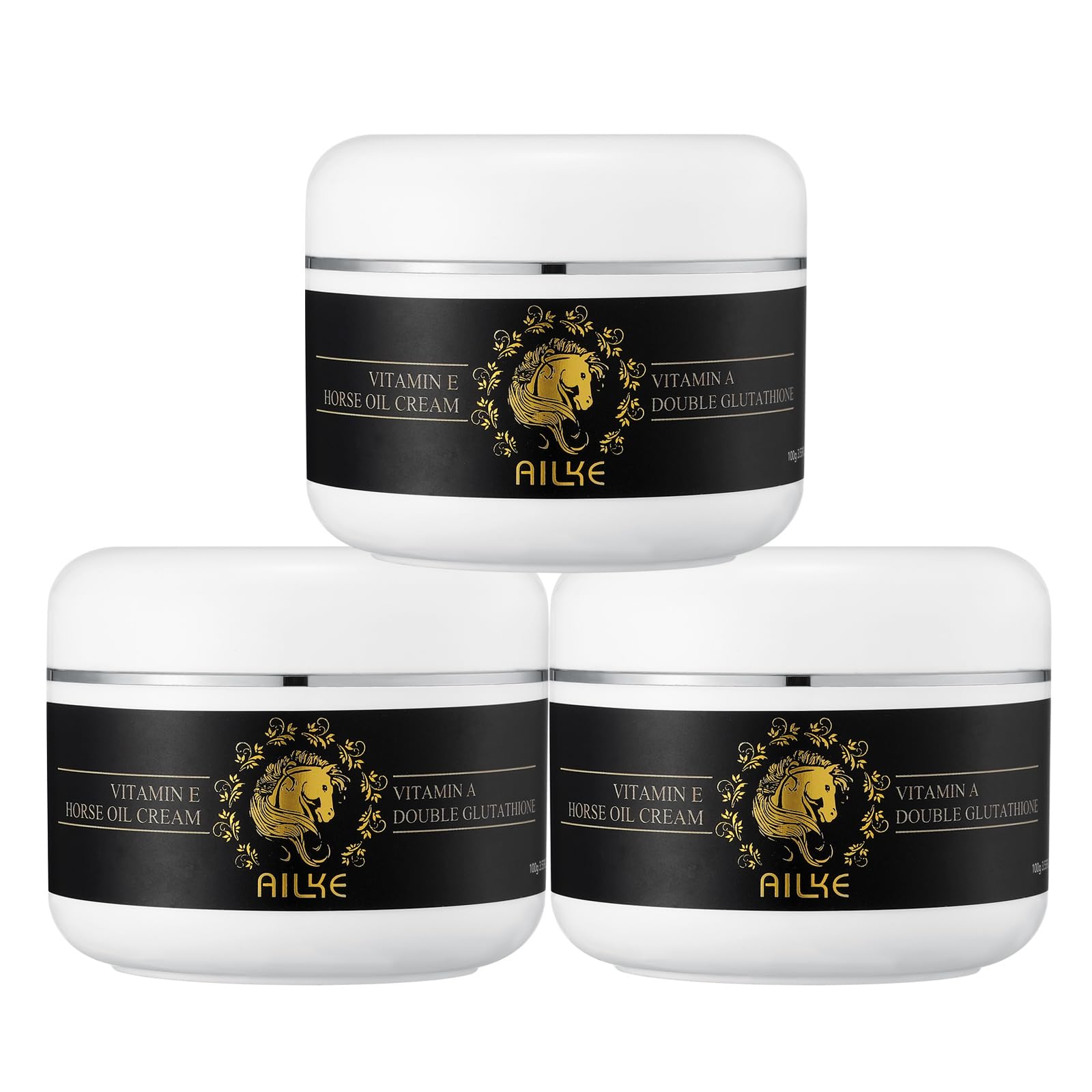 Unlock the secret to radiant, youthful skin with this luxurious Vitamin E Horse Oil Cream from AILKE. Infused with the nourishing power of horse oil and enriched with vitamin E, this rich cream deeply hydrates and revitalizes your complexion. The addition of Vitamin A Double Glutathione enhances its rejuvenating properties and promotes a brighter and more even complexion. Enjoy the luscious formula that melts effortlessly into your skin, leaving it silky soft and radiantly glowing. Experience the transforming effects of this premium cream and reveal your most beautiful, radiant self. SAFETY WARNING This product is for external use only and all skin types are different, so follow the instructions below for best results. Test on a small area of skin first. If you have an allergic reaction allergy, stop using it. If a reaction occurs, discontinue use immediately. Do not use if you are sensitive to ingredients. Avoid contact with the eyes. If contact occurs, rinse thoroughly with water. This product is not intended to diagnose, alleviate, treat, cure, or prevent diseaseSuitable for all skin types: The gentle, non-irritating formula can be used on all skin types. VERSATILE APPLICATION: Suitable for use on face, hands, neck and body, this multi-purpose cream can be incorporated into your daily skin care routine. LIGHTWEIGHT TEXTURE: The non-greasy, fast-absorbing formula leaves skin feeling soft, smooth and supple without heavy or sticky residue. RADIANT COMPLEXION: This cream helps improve skin elasticity and promotes a youthful, radiant appearance. LIGHTENING AND MOISTURE: Enriched with glutathione and natural vitamin A, it brightens and evens skin tone while providing deep nourishment and hydration.AILKE Verhelderende crème voor gezicht, lichaamshanden, met glutathion, vitamine A, intensieve vochtinbrengende crème, gladde en zachte huid, verbetert de doffe huid, 100 ml (verpakking van 3) 3 stuks. Ontgrendel het geheim van een stralende, jeugdige huid met deze luxe Vitamin E Horse Oil Cream van AILKE. Doordrenkt met de voedende kracht van paardenolie en verrijkt met vitamine E, hydrateert deze rijke crème diep en revitaliseert je teint. De toevoeging van vitamine A Double Glutathion verbetert de verjongende eigenschappen en bevordert een helderdere en gelijkmatigere teint. Geniet van de weelderige formule die moeiteloos in uw huid smelt, waardoor deze zijdezacht en stralend gloeit. Ervaar de transformerende effecten van deze premium crème en onthul je mooiste, stralende zelf. VEILIGHEIDSWAARSCHUWING Dit product is alleen voor uitwendig gebruik en alle huidtypes zijn verschillend, dus volg de onderstaande instructies voor het beste resultaat. Test eerst op een klein deel van de huid. Als u een allergische reactie allergie heeft, stop dan met het gebruik ervan. Als er een reactie optreedt, stop dan onmiddellijk met het gebruik. Niet gebruiken als u gevoelig bent voor ingrediënten. Vermijd contact met de ogen. Als er contact optreedt, spoel dan grondig met water. Dit product is niet bedoeld om ziekten te diagnosticeren, te verlichten, te behandelen, te genezen of te voorkomenGeschikt voor alle huidtypen: de zachte, niet-irriterende formule kan op alle huidtypes worden gebruikt. VEELZIJDIGE TOEPASSING: Geschikt voor gebruik op gezicht, handen, nek en lichaam, deze multifunctionele crème kan worden opgenomen in uw dagelijkse huidverzorgingsroutine. LICHTGEWICHT TEXTUUR: De niet-vette, snel absorberende formule laat de huid zacht, glad en soepel aanvoelen zonder zware of plakkerige resten. STRALENDE COMPLEXIE: Deze crème helpt de elasticiteit van de huid te verbeteren en bevordert een jeugdige, stralende uitstraling. VERLICHTING EN VOCHTEN: Verrijkt met glutathion en natuurlijke vitamine A, verheldert en egaliseert het de huidskleur terwijl het diepe voeding en hydratatie biedt.