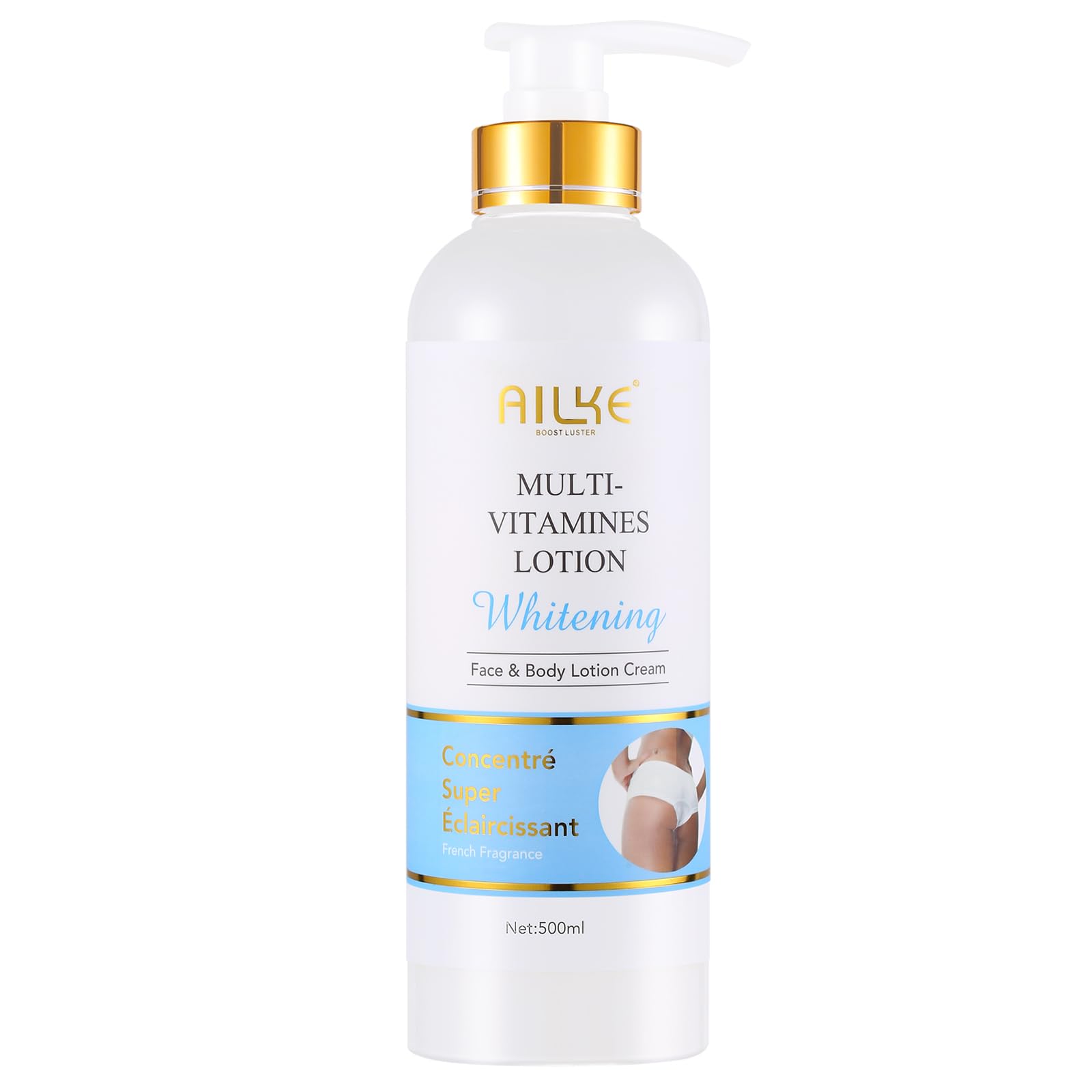 AILKE's Multi Vitamin Bleaching Lotion is a luxurious body cream, this concentrated formula is enriched with vitamins and nourishing ingredients to hydrate and illuminate the skin. The texture is light, non-greasy and quickly absorbed, leaving your skin feeling smooth, soft and radiant. Wonderfully French scented, this lotion not only improves the appearance of your skin, but also lets you enjoy its refreshing scent. Enjoy the pampering experience of this Multivitamin Bleaching Lotion and reveal a healthier, brighter you. SAFETY WARNING This product is for external use only and all skin types are different, so follow the instructions below for best results. Test on a small area of skin first. If you have an allergic reaction allergy, stop using it. If a reaction occurs, discontinue use immediately. Do not use if you are sensitive to ingredients. Avoid contact with the eyes. If contact occurs, rinse thoroughly with water. This product is not intended to diagnose, alleviate, treat, cure, or prevent diseaseSPECIALIZING IN HIGH QUALITY SKIN CARE FOR OVER 30 YEARS: We strive to use only real, effective, high-quality ingredients in our products. Our philosophy is to bring beauty to the world. Fast Absorption: Our lightweight, non-greasy formula provides a luxurious experience that absorbs quickly, making it perfect for use after a shower or bath, or whenever your skin feels dry or tight. Leaves your skin feeling silky soft and energetic. Suitable for all skin types. MULTI-VITAMIN: Adding a multi-vitamin body lotion to your skin care routine can help you achieve a healthier, radiant and youthful complexion. It also helps to stimulate collagen production, improve skin elasticity and firmness, smooth the skin and minimize fine lines. Moisturize and moisturize for 24 hours: Our body lotion contains a variety of plant extracts, deeply moisturizes your skin and keeps it soft and supple all day long. SKIN WHITENING: Our body lotion contains niacinamide, multivitamin and nourishing ingredients, which are effective in increg skin radiance and improving dull skin. Gives you a brighter, more even complexion.AILKE Multi-Vitamine Bleaching Body Lotion, intensieve hydratatie, schone, gladde, zachte huid, gelijkmatige huidtint, whitening lichaamscrème voor alle huidtypes, 500 ml (pak van 1) 1 exemplaar AILKE's Multi vitamine Bleaching Lotion is een luxe bodycreme, deze geconcentreerde formule is verrijkt met vitamines en voedende ingrediënten om de huid te hydrateren en te verlichten. De textuur is licht, niet vettig en trekt snel in, waardoor je huid glad, zacht en stralend aanvoelt. Heerlijk Frans geurend, deze lotion verbetert niet alleen het uiterlijk van je huid, maar laat je ook genieten van de verfrissende geur. Geniet van de verwennervaring van deze Multivitamine Bleaching Lotion en onthul een gezondere, helderdere jij. VEILIGHEIDSWAARSCHUWING Dit product is alleen voor uitwendig gebruik en alle huidtypes zijn verschillend, dus volg de onderstaande instructies voor het beste resultaat. Test eerst op een klein deel van de huid. Als u een allergische reactie allergie heeft, stop dan met het gebruik ervan. Als er een reactie optreedt, stop dan onmiddellijk met het gebruik. Niet gebruiken als u gevoelig bent voor ingrediënten. Vermijd contact met de ogen. Als er contact optreedt, spoel dan grondig met water. Dit product is niet bedoeld om ziekten te diagnosticeren, te verlichten, te behandelen, te genezen of te voorkomenSPECIALISEREN IN HOOGWAARDIGE HUIDVERZORGING VOOR MEER DAN 30 JAAR: we streven ernaar om alleen echte, effectieve, hoogwaardige ingrediënten in onze producten te gebruiken. Onze filosofie is om schoonheid aan de wereld te brengen. Snelle absorptie: onze lichtgewicht, niet-vette formule biedt een luxe ervaring die snel absorbeert, waardoor het perfect is voor gebruik na een douche of bad, of wanneer uw huid droog of strak aanvoelt. Laat je huid zijdezacht en energiek aanvoelen. Geschikt voor alle huidtypes. MULTI-VITAMINE: Het toevoegen van een multi-vitamine bodylotion aan uw huidverzorgingsroutine kan u helpen een gezondere, stralende en jeugdige teint te krijgen. Het helpt ook om de productie van collageen te stimuleren, de elasticiteit en stevigheid van de huid te verbeteren, de huid glad te maken en fijne lijntjes te minimaliseren. 24 uur hydrateren en hydrateren: onze bodylotion bevat een verscheidenheid aan plantenextracten, hydrateert je huid diep en houdt hem de hele dag zacht en soepel. HUID WITENING: Onze bodylotion bevat niacinamide, multivitamine en voedende ingrediënten, die effectief zijn in het verhogen van de stralende huid en het verbeteren van de doffe huid. Geeft je een helderdere, gelijkmatigere teint.