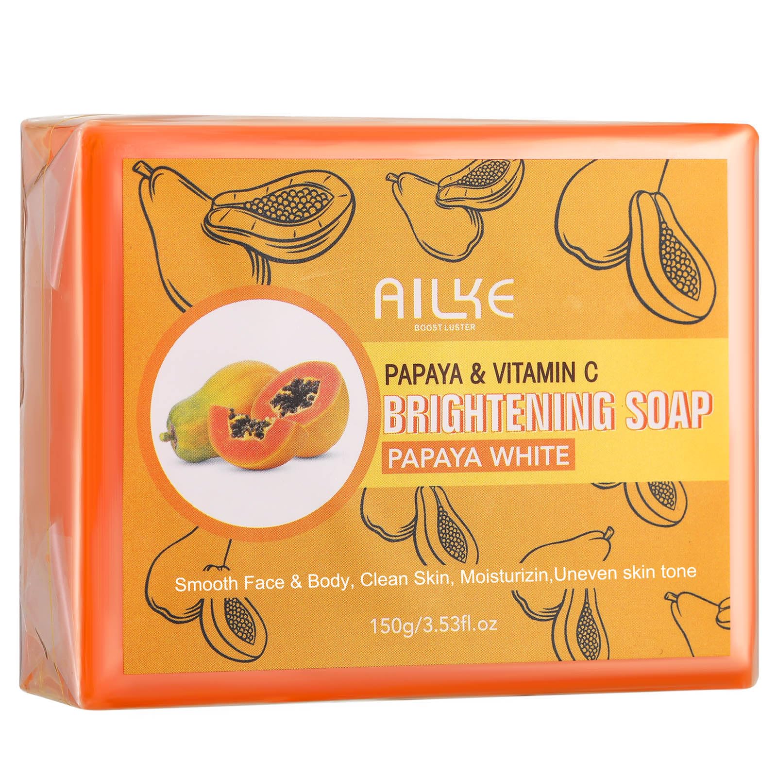 DESCRIPTION DU PRODUIT DESCRIPTION DU PRODUIT 1- AILKE brightening Soap is a luxurious blend of natural ingredients that harnesses the power of Vitamin C and kojic acid to brighten and even out your skin tone, Designed to revitalize your skin. 2 -Coconut oil smoothes and moisturizes the skin, the aroma of papaya invigorates your senses, and tea tree oil delivers a gentle, natural cleanse. 3 -This soap is a delightful indulgence for your skin, leaving it feeling soft, radiant and youthful. Indulge in the luxury of whitening soap and let the natural ingredients work their magic on your skin. AVERTISSEMENT DE SÉCURITÉ This product is for external use only and all skin types are different, so for best results, please follow the instructions below. First use-test on a small part of the skin. If you have an allergic reaction allergy, please stop using it. If any reaction occurs, stop using it immediately. Do not use if you are sensitive to any ingredients. Avoid contact with eyes. If contact occurs, rinse thoroughly with water. This product is not intended to diagnose, alleviate, treat, cure or prevent any diseaseVersatile Cleansing: Suitable for all skin types, leaving your skin feeling refreshed and revitalized and Smoothed. Versatile Use: Can be used on face and body for a refreshing, spa-like experience at home. Refuse To Dry Out After A Shower: Formulated with natural ingredients and hyaluronic acid to deeply cleanse without stripping skin of essential moisture. Clean Skin: Removes dark spots and evens out skin tone, leaving you with a bright, clean skin appearance. Brightening Soap: Enriched with vitamin C, kojic acid, and papaya extracts to gently exfoliate and brighten dull skin.AILKE Papaya Vitamin C Brightening Soap Bar, Whitening, Smooth Skin, Reduce Dark Spots, Clean Stains, Uneven Skin Tone Body Wash, for Face and Body, 150g (Pack of 1)DESCRIPTION DU PRODUIT DESCRIPTION DU PRODUIT 1- AILKE brightening Soap is a luxurious blend of natural ingredients that harnesses the power of Vitamin C and kojic acid to brighten and even out your skin tone, Designed to revitalize your skin. 2 -Coconut oil smoothes and moisturizes the skin, the aroma of papaya invigorates your senses, and tea tree oil delivers a gentle, natural cleanse. 3 -This soap is a delightful indulgence for your skin, leaving it feeling soft, radiant and youthful. Indulge in the luxury of whitening soap and let the natural ingredients work their magic on your skin. AVERTISSEMENT DE SÉCURITÉ This product is for external use only and all skin types are different, so for best results, please follow the instructions below. First use-test on a small part of the skin. If you have an allergic reaction allergy, please stop using it. If any reaction occurs, stop using it immediately. Do not use if you are sensitive to any ingredients. Avoid contact with eyes. If contact occurs, rinse thoroughly with water. This product is not intended to diagnose, alleviate, treat, cure or prevent any diseaseVersatile Cleansing: Suitable for all skin types, leaving your skin feeling refreshed and revitalized and Smoothed. Versatile Use: Can be used on face and body for a refreshing, spa-like experience at home. Refuse To Dry Out After A Shower: Formulated with natural ingredients and hyaluronic acid to deeply cleanse without stripping skin of essential moisture. Clean Skin: Removes dark spots and evens out skin tone, leaving you with a bright, clean skin appearance. Brightening Soap: Enriched with vitamin C, kojic acid, and papaya extracts to gently exfoliate and brighten dull skin.