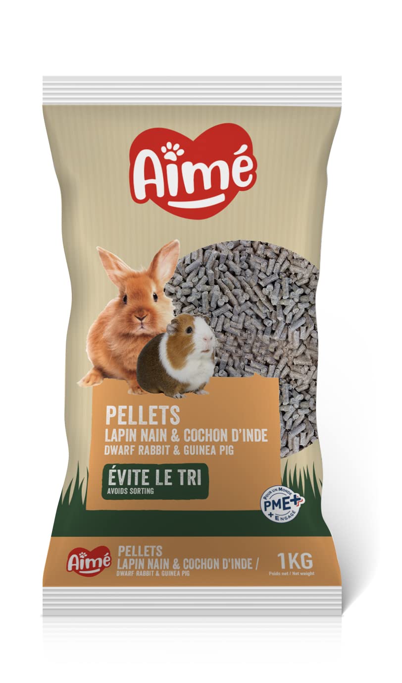 Loved - Pellets for Dwarf Rabbits and Guinea Pigs Complete food for dwarf rabbits and guinea pigs DIRECTIONS: Leave clean hay available to your animal at all times and in unlimited quantities. Offer him fresh, washed vegetables and fruits regularly. Respect the recommended daily rations. Make sure your companion always has fresh, clean water available. DOSE: Daily ration for dwarf rabbits: 25g per meal (2 meals per day). Daily ration for the guinea pig: 15g per meal (2 meals per day). COMPOSITION: Cereals, vegetables, by-products of plant origin, seeds, sugars, mineral substances, nuts ANALYTICAL CONSTITUENTS: Crude protein 15 , crude fiber 14 , crude fat 3 , raw ash 9 , Additives: VITAMINS: Vitamin A 7500 IU kg, vitamin D3 830 IU kg, TRACE ELEMENTS: 3b101 Fe: 53 mg kg, 3b202 I: 0.2 mg kg, 3b304 Co: 0.08 mg kg, 3b405 Cu: 7.5 mg kg, 3b502 Mn: 23 mg kg, 3b603 Zn: 60 mg kg, 3b801 Se: 0.08 mg kg, STORAGE ADVICE: Store in a cool, dry place, away from light. Leave fresh, clean water available to your pet at all times. FORMAT: 1 kg bag Do not leave within reach of children About Aimé With more than 50 years of experience, the French brand Aimé, from the Agrobiothers Laboratoire group, brings together more than 160 enthusiasts across 3 production units (Hygiene Care, Seeds Quartz and Saddlery Comfort) with an integrated research laboratory supported by internal and external testers. Aimé offers a range of products and accessories to strengthen the bond of love that unites you with your animal: toys, treats, beds, litter boxes and scratching posts and much more. 70 of Aimé products come from France and Europe. DIRECTIONS FOR USE Serve 25g per meal (2 meals day) for the dwarf rabbit and 15g per meal (2 meals day) for the guinea pig.[Aimé, pet expert] The Aimé brand belongs to the Agrobiothers group, which covers all the needs of animals: food, accessories, treatments, hygiene and play. A key French company in the sector. [Directions for use] Serve 25g per meal (2 meals day) for dwarf rabbits and 15g per meal (2 meals day) for guinea pigs. Tasty and digestible, they offer your pet a diet without excess or deficiency while ensuring the regular maintenance of its incisors. [Tasty and digestible] Aimé pellets offer your pet a varied and balanced diet. Dwarf rabbit and guinea pig kibble has been specially developed to meet your pet's specific nutritional needs on a daily basis. [Source of vitamins] Your pet may have preferences in its food, which could cause deficiencies and affect its health. Aimé pellets allow you to avoid sorting food. Rich in fiber and a source of vitamins, Aimé pellets contain vitamins A and D3 to maintain its health. [Nutritional Intake] Your small mammal needs a diet composed of different ingredients for its nutritional balance and health. Aimé pellets for dwarf rabbits and guinea pigs offer quality nutrition through a balanced mix of foods, as well as the nutritional intake your pet needs, in every bite. Aimé - Granulés pour Lapins Nain et Cochon d'Inde Aliment complet pour lapins nains et cochons d'Inde MODE D'EMPLOI : Laisser à disposition de votre animal du foin propre en permanence et en quantité illimitée. Offrez lui régulièrement des légumes et des fruits frais et lavés. Respectez les rations journalières recommandées. Veillez à ce que votre compagnon ait en permanence de l'eau fraîche et propre à disposition. DOSE : Ration journalière pour le lapin nain : 25g par repas (2 repas par jour). Ration journalière pour le cochon d'Inde : 15g par repas (2 repas par jour). COMPOSITION : Céréales, légumes, sous-produits d'origine végétale, graines, sucres, substances minérales, noix CONSTITUANTS ANALYTIQUES : Protéine brute 15 , cellulose brute 14 , matières grasses brutes 3 , cendres brutes 9 , Additifs : VITAMINES : Vitamine A 7500 UI kg, vitamine D3 830 UI kg, OLIGO-ELEMENTS : 3b101 Fe: 53 mg kg , 3b202 I: 0,2 mg kg, 3b304 Co: 0,08 mg kg, 3b405 Cu: 7,5 mg kg, 3b502 Mn: 23 mg kg, 3b603 Zn: 60 mg kg, 3b801 Se: 0,08 mg kg, CONSEIL DE CONSERVATION : À conserver dans un endroit frais et sec, à l'abri de la lumière. Laisser de l'eau fraîche et propre en permanence à disposition de votre animal. FORMAT : Sac de 1 kg Ne pas laisser à la portée des enfants À propos de Aimé Avec plus de 50 ans d'expérience, la marque française Aimé, du groupe Agrobiothers Laboratoire, regroupe plus de 160 passionnés sur 3 unités de production (Hygiène Soin, Graines Quartz et Sellerie Confort) avec un laboratoire de recherche intégré soutenu par des testeurs internes et externes. Aimé propose une gamme de produits et d'accessoires pour renforcer le lien d'amour qui vous unit à votre animal : des jouets, des friandises, des couchages, des litières et des griffoirs et bien plus. Les produits Aimé proviennent à 70 de France et d'Europe. MODE D'EMPLOI Servez 25g par repas (2 repas jour) pour le lapin nain et 15g par repas (2 repas jour) pour le cochon d'Inde.[Aimé, expert animalerie] La marque Aimé appartient au groupe Agrobiothers, qui couvre l'ensemble des besoins des animaux : nourriture, accessoires, traitements, hygiène et jeu. Une entreprise française incontournable du secteur. [Conseil d'utilisation] Servez 25g par repas (2 repas jour) pour le lapin nain et 15g par repas (2 repas jour) pour le cochon d'Inde. Savoureuses et digestes, elles offrent à votre animal une alimentations sans excès, ni carrence tout en assurant l'entretien regulier de ses incisives. [Savoureux et digestes] Les granulés Aimé offrent à votre animal une alimentation variée et équilibrée. Les croquettes pour lapin nain et cochon d'inde ont été specialement élaborées pour répondre quotidiennement aux besoins nutritionnels spécifiques de votre animal. [Source de vitamines] Votre animal peut avoir des préférences dans sa nourriture, ce qui pourrait lui causer des carences et influencer sa santé. Les granulés Aimé permettent d'éviter le tri des aliments. Ri