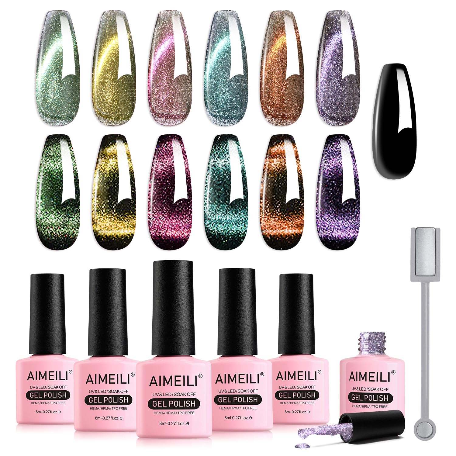 ?hema-free gel nail polish: Hema-free, HPMA-free, TPO-free formula of gel nail polish for nail art make it gentle to apply your nails safer and healthier.?Vegan, free of animal experiments: Aimeili Gel Nailack products are vegan, cruel-free, safe, non-toxic, environmentally friendly and reliable, since 90% of raw materials are manufactured in the USA and Europe and correspond to EU security regulations.? Lang: long for 21+ days with a perfect shine.No notches, chips or spots.Hardens under the UV or LED lamp (curing times vary depending on the lighting system).? Cat eye effect: black or dark color base for the amazing cat Magnetic effect recommended.Different magnetic sticks will give different megnetic effect, of course with two magnetic board the same time will be more beautiful.? AND Colors: 6 Colors 9d Cat Eye Gel nail polish (contains 1 magnet), 8 ml per bottle.With these carefully selected fashion colors you can not only create charming and shiny beautiful nails, but also an ideal gift for yourself, friends, family, etc. (Note: Please carry out a skin test each time).?HEMA-FREE Gel Nagellack: HEMA-freie, HPMA-freie, TPO-freie Formel von Gel Nagellack für Nagelkunst machen es sanfter, um Ihre Nägel sicherer und gesünder gelten. ?VEGAN, TIERVERSUCHSFREI: AIMEILI Gel Nagellack Produkte sind vegan, grausam-frei, sicher, ungiftig, umweltfreundlich und zuverlässig, da 90% der Rohstoffe in den USA und Europa hergestellt werden und den EU-Sicherheitsvorschriften entsprechen. ?Lang anhaltend: Lang anhaltend für 21+ Tage mit perfektem Glanz. Keine Kerben, Chips oder Flecken. Härtet unter UV- oder LED-Lampe aus (Aushärtungszeiten variieren je nach Beleuchtungssystem). ?Katzenaugen-Effekt: Schwarz oder dunkel Farbe Basis für die erstaunliche Katze magnetische Wirkung empfohlen. Verschiedene magnetische Stick wird verschiedene megnetic Wirkung geben, natürlich mit zwei magnetischen Bord die gleiche Zeit wird mehr schöne Wirkung zu schaffen. ?Reiche Farben: 6 Farben 9D Cat Eye Gel-Nagellack (Enthält 1 Magneten), 8 ml pro Flasche. Mit diesen sorgfältig ausgewählten modischen Farben können Sie nicht nur charmante und glänzende schöne Nägel kreieren, sondern auch ein ideales Geschenk für sich selbst, Freunde, Familie usw. (Hinweis: Bitte führen Sie vor der Maniküre JEDES MAL einen HAUTTEST durch).AIMEILI Cat Eye UV Gel HEMA Free UV Lack Gel Nagellack Set 8ml 6 Farben Cat Eye Nail Polish UV Nagellack Set Cat Eye Gel Set UV Nagellack Magnet Kit 48 KIT6-48_8ML