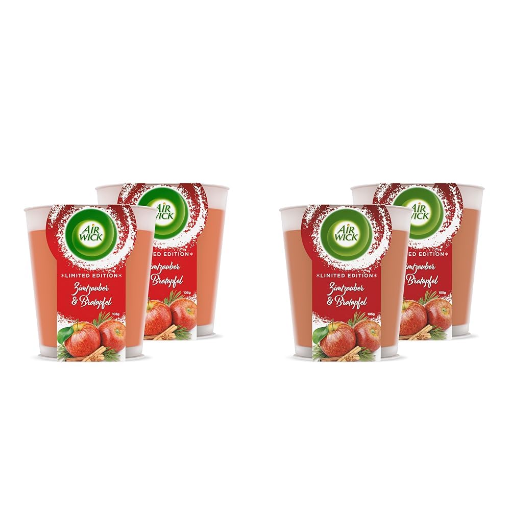 together against plastic in the ocean: With every purchase you help us collect a total of 5 million plastic bottles from the environment (when selling through /Sediva/Lamos4U 1 bottle: 20g plastic waste).Scope of delivery: 2 x well-being fragrance candle from Air Wick in the fragrance direction cinnamon magic and baked apple / in the duo pack / room fragrance that makes every room in the apartment freshly smell.The feel-good candles from Air Wick come in a subtle, satin design glass that ideally fits into the decoration of the respective room.The high -quality candle ensures a long burning time of up to 20 hours and thus ensures a particularly long -lasting feeling of relaxation - from the first to the last light.Timeless naturalness: The aroma candle contains high-quality essential oils that exude the fresh fragrance of cinnamon and baked apple in the apartment.The noble fragrance candle spreads its intensive fresh fragrance oil and gives each home the fragrance of natural cleanliness / Air Wick Wohllebell fragrance candles fit in every ambience.The following information applies to each unit per pack.