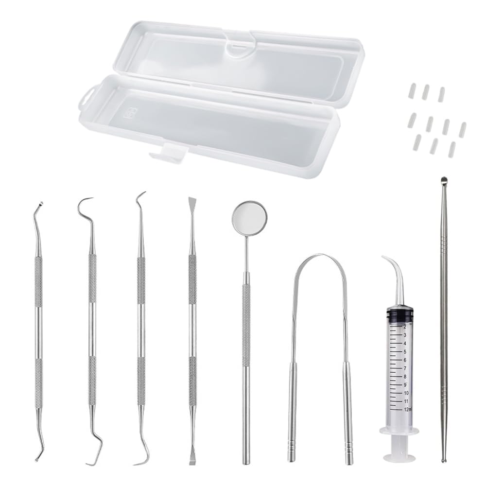The kit also comes with a case for hygienic storage and travel convenience. Oral irrigator: the plunger of this irrgator fits well, easy to push down and pull up, won't detached. It works well to get into small spaces, can reach places where your floss and toothbrush can't reach. Tonsil Stone Remover Tool: this 7 inch stainless steel extractor comes with 10 soft silicone tips, offering a durable and hygienic solution for stubborn tonsil stones. Designed to be rust-resistant, unbendable, and unbreakable, it is dishwasher-safe and easily sterilized by boiling, ensuring long-lasting use. The tool's precise design allows it to reach deep into crevices, effectively tackling even the most persistent stones. Tongue Scraper: crafted from crafted from 100 surgical grade 304 stainless steel to ensure durability and optimal performance. Its specialized design effectively cleans hard-to-reach areas on your tongue, keeping your mouth feeling fresh and clean. 5pcs Teeth Plaque Removers: crafted from 100 surgical grade 304 stainless steel, they helps you remove tough plaque, stubborn tartar buildup stains on or between teeth easily at home effectively. You can add using these to your dental care routine and keep your teeth cleaned. Dental Care Kit: 5pcs teeth plaque removers 1pc tongue scraper 1pc tonsil stone extractor with 10pcs soft silicone tips 1pc oral irrigator 1pc plastic storage box with hook.