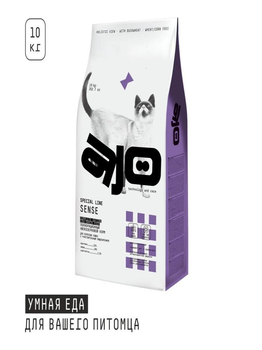 СУХОЙ ПОЛНОРАЦИОННЫЙ КОРМДЛЯ КОШЕК С ЧУВСТВИТЕЛЬНЫМ ПИЩЕВАРЕНИЕМ. Вся продукция AJO изготавливается на новейшем заводе, оснащенном сверхсовременным высокотехнологичным оборудованием, и соответствует мировым стандартам качества. C ГречкойГречиха — одна из самых полезных круп, имеет высокую питательность, гипоаллергенность, антитоксические свойства, богата железом, магнием, калием, фосфором, витаминами группы ВC РисомБлагоприятное влияние на кишечник за счёт обволакивающих свойств, укрепляет сердце и сосуды, богат железом и цинком, содержит клетчатку и важные для здоровья питомца аминокислоты.Без кукурузыВместо пшеницы и кукурузы в составе присутствует рис/гречка в качестве источников углеводов. Данные ингредиенты менее аллергенны (не содержат глютен), а также имеют более высокую пищевую ценностьЯблокоУлучшает работу кишечника, очищает от шлаков и токсинов. Содержит витамины E, A, витамины группы B и аскорбиновую кислоту.брокколиПозитивно влияет на пищеварение, сердечно-сосудистую, иммунную системы. Обладает противовоспалительные свойствами. Защищает от аллергии. Укрепляет кости.МОРСКИЕ ВОДОРОСЛИИсточник витаминов А, С, D, E, K и витамины группы B. Содержит макро- и микроэлементы, фосфор, цинк, магний и йод. Обладают иммуномодулирующими, противовирусными и противовоспалительными свойствами.ЗЕЛЕНЫЙ ЧАЙСодержит марганец, хром, селен и цинк. Помогает снизить риск развития болезней сердца и сосудов, предотвращает кариес и образование камней в почках.ОЛЕНИНАИсточник кальция, калия, цинка, фосфора и витаминов группы