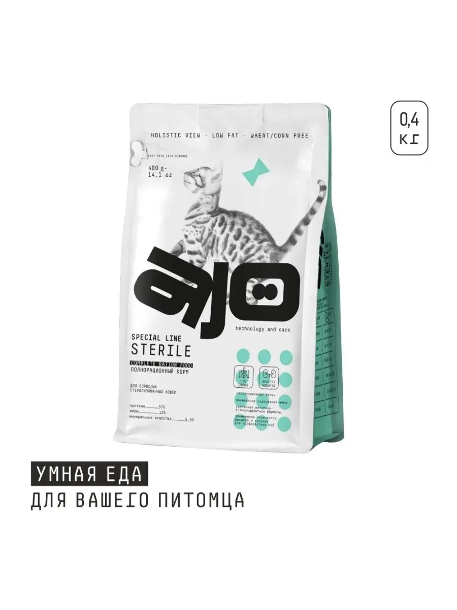 Сухой корм Ajo ( Айо ) Sterile для активных стерилизованных кошек с высоким содержанием белка. Корм суперпремиум класса -профилактика мочекаменной болезни для стерилизованных кошек за счет оптимизированной минерализации рациона