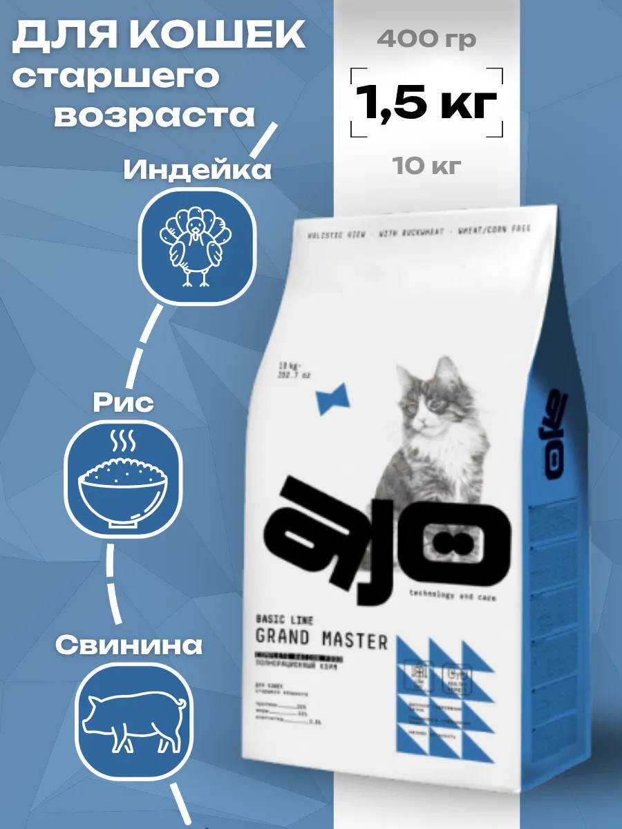 | Комплектация | 1 упаковка сухого корма AJO Cat holistic Grand Master с курицей для кошек старшего возраста 1.5 кг |