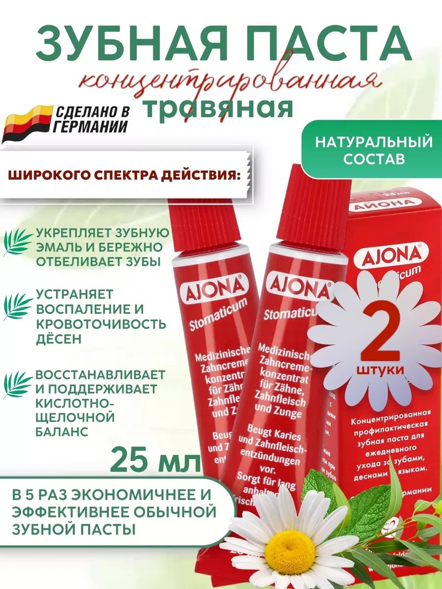 Ajona Айона - универсальная травяная немецкая концентрированная зубная паста широкого спектра применения. Диапазон полезных терапевтических свойств зубной пасты Ajona очень широкий, ведь она оказывает уход за всей полостью рта, начиная с зубной эмали и дёсен, заканчивая микрофлорой и кислотно-щелочным балансом: защищает от кариеса, борется с образованием зубного камня и налёта, устраняет кровоточивость и воспаление десен, уничтожает 99% микробов в первую минуту применения, а также реминерализует, отбеливает и полирует эмаль. Не смотря на свой маленький объем (25 мл), Ajona заменит Вам 3 тюбика обычной пасты по 75 мл. На одно применение достаточно выдавить пасту размером с горошину. Благодаря насыщенному и высококонцертрованному составу, паста в 5 раз эффективнее, мощнее и результативнее своих аналогов. За счет присутствия в составе бисаболола, природного натурального, противовоспалительного компонента, получаемого путем дистилляции из масла аптечной ромашки, паста оказывает активное заживляющее и противовоспалительное действие. Анетол - органическое соединение из аниса и бадьяна оказывает обезболивающее, противовирусное и антимикробное действие. Тимол -является универсальным антисептиком для полости рта. Ментол, эвкалиптол, линалоол - освежают, убирают неприятный запах изо рта, обладают антимикробными и противогрибковыми свойствами. Все соединения в составе пасты полностью натуральные и получены безвредным природным путем. Содержание большого количества кальция и компонентов, улучшающих его усвоение, осуществляют реминерализацию и укрепление зубной эмали.Наличие бикарбоната натрия в составе пасты позволяет поддерживать нужный кислотный баланс во рту. Как известно, оптимальной средой в полости рта является слабощелочная. При снижении кислотности ниже 5 ед. начинается деминерализация эмали и увеличивается риск развития кариеса. Используя зубную пасту Ajona на постоянной основе, Ваши зубы всегда будут белыми и крепкими, дыхание свежим, а дёсна здоровыми.