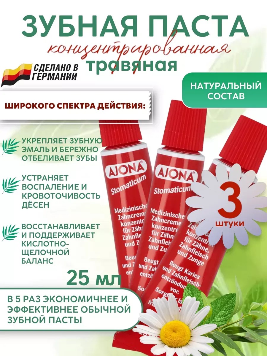Ajona Айона - универсальная травяная немецкая концентрированная зубная паста широкого спектра применения. Диапазон полезных терапевтических свойств зубной пасты Ajona очень широкий, ведь она оказывает уход за всей полостью рта, начиная с зубной эмали и дёсен, заканчивая микрофлорой и кислотно-щелочным балансом: защищает от кариеса, борется с образованием зубного камня и налёта, устраняет кровоточивость и воспаление десен, уничтожает 99% микробов в первую минуту применения, а также реминерализует, отбеливает и полирует эмаль. Не смотря на свой маленький объем (25 мл), Ajona заменит Вам 3 тюбика обычной пасты по 75 мл. На одно применение достаточно выдавить пасту размером с горошину. Благодаря насыщенному и высококонцертрованному составу, паста в 5 раз эффективнее, мощнее и результативнее своих аналогов. За счет присутствия в составе бисаболола, природного натурального, противовоспалительного компонента, получаемого путем дистилляции из масла аптечной ромашки, паста оказывает активное заживляющее и противовоспалительное действие. Анетол - органическое соединение из аниса и бадьяна оказывает обезболивающее, противовирусное и антимикробное действие. Тимол -является универсальным антисептиком для полости рта. Ментол, эвкалиптол, линалоол - освежают, убирают неприятный запах изо рта, обладают антимикробными и противогрибковыми свойствами. Все соединения в составе пасты полностью натуральные и получены безвредным природным путем. Содержание большого количества кальция и компонентов, улучшающих его усвоение, осуществляют реминерализацию и укрепление зубной эмали.Наличие бикарбоната натрия в составе пасты позволяет поддерживать нужный кислотный баланс во рту. Как известно, оптимальной средой в полости рта является слабощелочная. При снижении кислотности ниже 5 ед. начинается деминерализация эмали и увеличивается риск развития кариеса. Используя зубную пасту Ajona на постоянной основе, Ваши зубы всегда будут белыми и крепкими, дыхание свежим, а дёсна здоровыми.