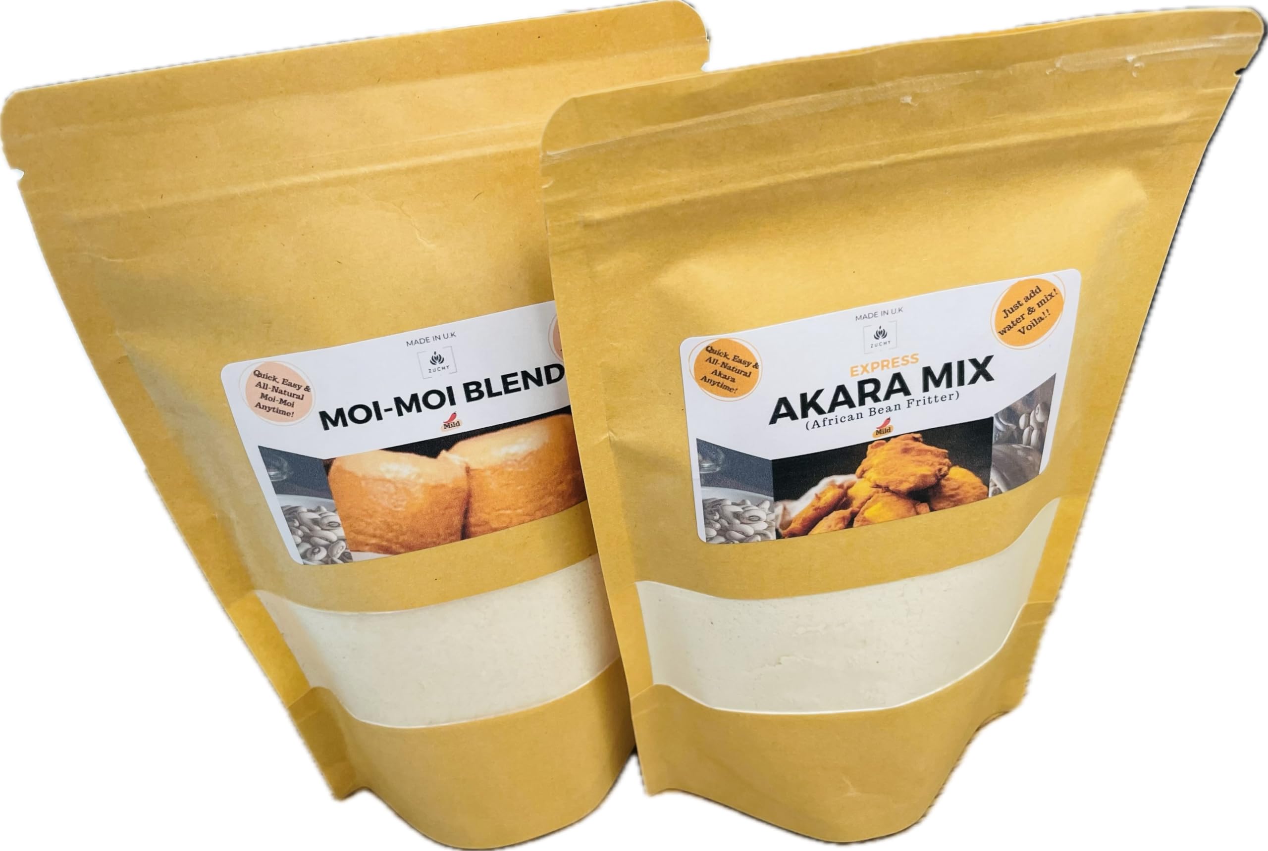 Have a taste of Nigerian akara & moi-moi in this combo bundle! - Quick, easy & non-complicated! | 100% Beans. | All natural ingredients. | Just add water | Quick, easy & non-complicated. | No preservatives, additives or artificial colours. | Vegan. GMO-free. Gluten-free. | Suitable for vegetarians. | All the heavy lifting done for you. INGREDIENTS Black-eyed beans, Onions, Bell Peppers, Salt, Seasoning, PeppersIn addition, it essentially offers convenience - no beans peeling, washing & blending. All the heavy lifting done for you. Just add water & oil, and steam-cook (moi-moi). For akara, just add water and fry. Then sit back to enjoy your delicious, mouth-watering moi-moi or akara!. Suitable for vegetarians. GMO-free. Gluten-free. No artificial colours, flavours or preservatives. Kids love it! Give them a quick fix of Nigerian delicious akara and moi-moi in no time - just like indomie! You will be replicating those Nigerian delicious meal-time experience!. Suitable for busy professionals looking for a quick, delicious and nutritious meal, or homesick Nigerians craving a taste of home. ‘Express Akara Mix’ and ‘Moi-Moi Blend’ will bring joy and satisfaction to all who try them, as it nourishes not only the body but also the soul. Offers a wide range of dietary preferences & enjoyable experience!. Instantly have your craving for local tasting, Nigerian akara and moi-moi satisfied in just a few simple steps, without compromising on nutrients because both ‘Express Akara Mix’ and ‘Moi-Moi Blend’ are cherished not only for their delicious taste but also for their versatility and nutritional value. They are rich sources of protein, vitamins, and minerals, making them satisfying and wholesome dish for people of all ages. Additionally, they can also be customized with various ingredients and spices to suit individual preferences. Inside each package of ‘Express Akara Mix’ or ‘Moi-Moi Blend’, customers would find everything they need to recreate the flavors of Nigerian akara and moi-moi in their own kitchens, in an ‘easy-to-use’ mix, carefully curated to maintain their natural nutritional value and offer delight to every member of the family!. However with life getting so busy these days in our modern world, with so many things demanding for one’s time, prepping your delicious all natural Nigerian akara or moi-moi could be very daunting, time-consuming and challenging. This is where ‘Express Akara Mix’ and ‘Moi-Moi Blend’ comes in. All the prepping is already done for you!. Moi-moi is a traditional Nigerian dish made from ground peeled beans, typically black-eyed peas, mixed with various ingredients and steamed to perfection. It is a popular delicacy enjoyed across Nigeria and is often served as a side dish or main course. Akara is a popular Nigerian food made from peeled black-eyed peas or brown beans that have been grounded into a paste, mixed with onions, salt, and spices, and then deep-fried. It is a common street food and breakfast dish in Nigeria, often served with bread or pap (a Nigerian porridge made from fermented cornmeal). Have a taste of Nigerian akara & moi-moi in this combo bundle! - Quick, easy & non-complicated!.