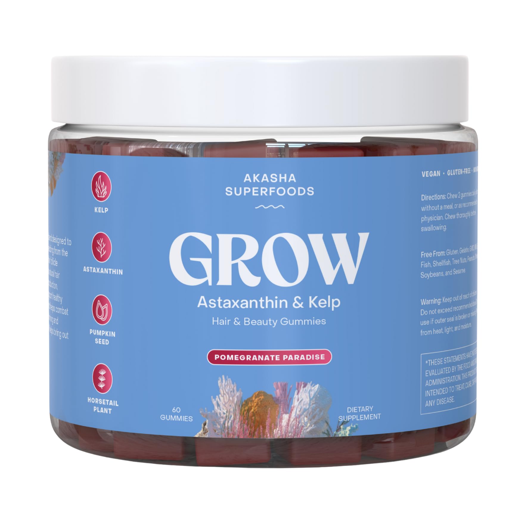 COMPATIBLE WITH ALL HAIR TYPES: Designed to fit a variety of hair types including straight, curly, fine, and thick. Pair with your favorite hair care products and explore consistent use to see how this ocean inspired blend fits into your personal routine. CLEAN VEGAN AND LIFESTYLE FRIENDLY: GROW is made with vegan, non GMO, and gluten free ingredients—no gelatin, dairy, or artificial colors. It's a mindful option for those looking to support their wellness routine with clean, plant based choices. DELICIOUSLY EASY TO TAKE: Bursting with fruity Pomegranate Paradise flavor, each gummy makes your daily routine feel like a delight. Just chew two daily, with or without food—no water or prep needed. A flavorful, approachable way to support your hair care goals. POWERED BY NUTRIENT RICH INGREDIENTS: Each gummy includes a thoughtfully selected blend of Astaxanthin, Kelp, Pumpkin Seed, and Horsetail Extract, plus Zinc and Vitamin E. These ingredients work together to nourish hair at the root and contribute to overall hair quality. INSPIRED BY OCEAN-BASED WELLNESS: GROW is a daily ritual rooted in ocean-sourced ingredients to support your hair and scalp from within. Featuring sea kelp and antioxidant-rich compounds, this formula is part of a holistic approach to hair care designed for consistent use.