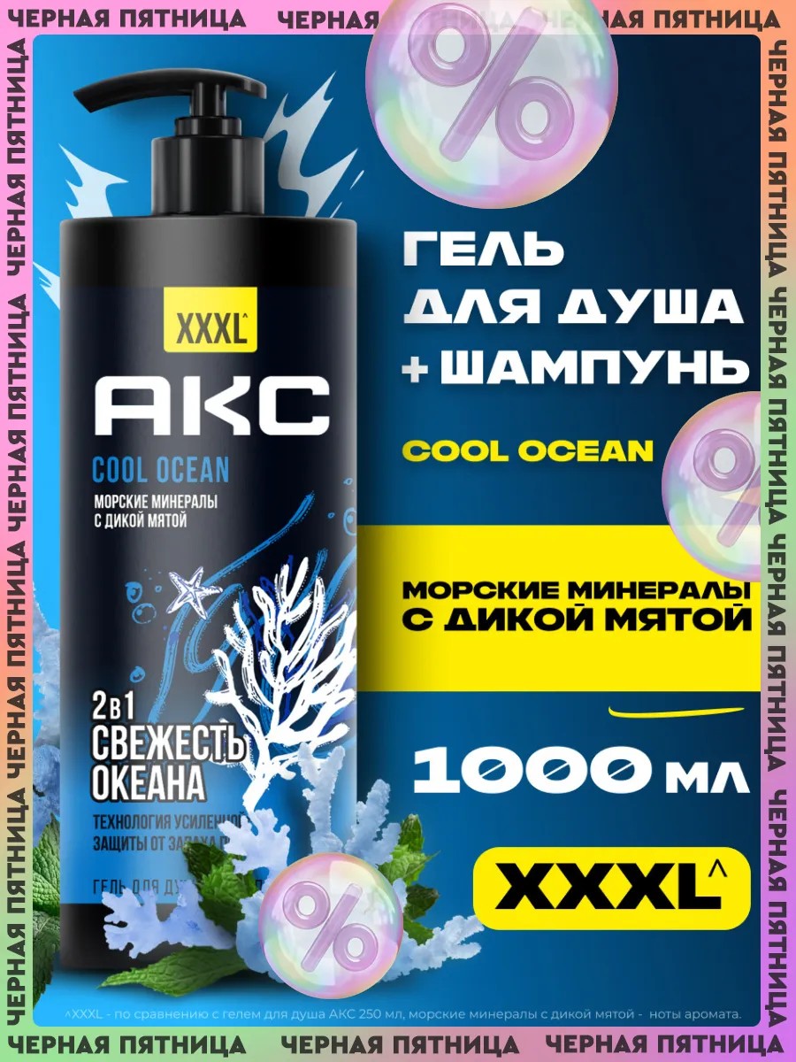 | Полное наименование товара | Акс Гель для душа мужской и шампунь для волос 2в1 Cool Ocean, парфюмированный с пребиотиками и морскими минералами, 1000 мл |