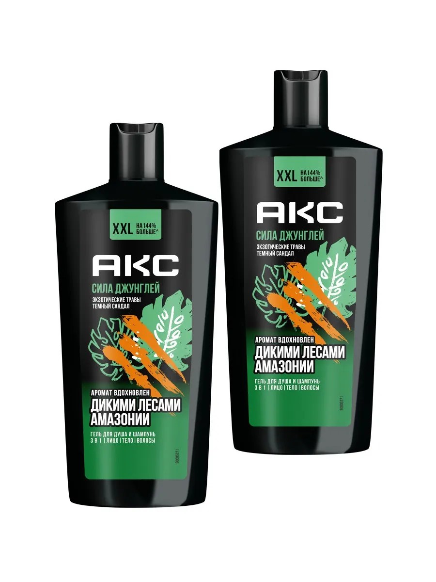 Мужской шампунь и гель для душа Акс XXL (610 мл) содержит на 144% больше продукта по сравнению со средством от Акс 250 мл. Так что, геля для очищения лица Сила джунглей тебе хватит надолго. Для максимального эффекта дополни шампунь парфюмированный мужской дезодорантом Акс.