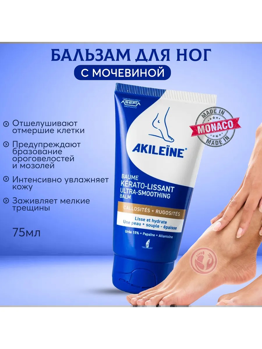 Бальзам для стопы Идеальная гладкость Акилайн Baume kerato lissant Akileine для ухода за очень сухой кожей ног, склонных к гиперкератозу и появлению мозолей. Смягчение грубой и шершавой кожи ног обеспечивается содержанием мочевины (15%) в сочетании с папаином, растительным ферментом, получаемым из папайи и влияющим на гидролиз белков. Эти два компонента отшелушивают отмершие клетки и предупреждают образование ороговелостей и мозолей, создают питание и восстановление кожи. Кроме этого, Акилейн крем для ног кератолик интенсивно увлажняет кожу, заживляет мелкие трещины, создаёт эффект гладкой кожи. Подходит для диабетической стопы. Средство для сухих пяток производится в Монако. Профессиональный уход для гладких пяток у вас дома.