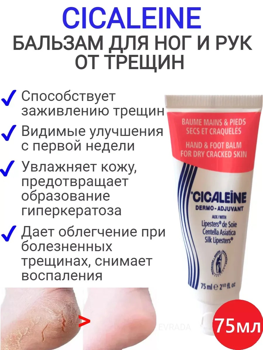 Крем бальзам от трещин на руках и ногах Сикалеин Heel and Hand Cracs Cicaleine Akileine уже после первого нанесения увлажненность кожи повышается на 64% в течение первого часа, значительно улучшается состояние кожи. В течение последующих 6 часов уровень увлажненности кожи возрастает еще на 40%. Это данные, полученные дерматологами, которые проводили клинические испытания Бальзама от трещин на группе добровольцев. После применения крема Акилайн в течение недели число и глубина трещин на руках значительно сокращается, снимается воспаление и раздражение кожи. По истечении 2 недель достигается оптимальный результат, кожа вновь становится эластичной, восстанавливается ее барьерная функция, трещины заживают. Проявления гиперкератоза сокращаются на 68%. Крем для ног Акилейн эффективное средство для проблемных стоп от сухости кожи. В крем входят компоненты преимущественно природного происхождения. Для лечения трещин крем наносится дважды в день непосредственно на них с помощью специального носика. Для профилактики рекомендуется использовать средство 3 раз в неделю. Показания к применению: сухая, грубая кожа на ногах, руках; трещины на коже.