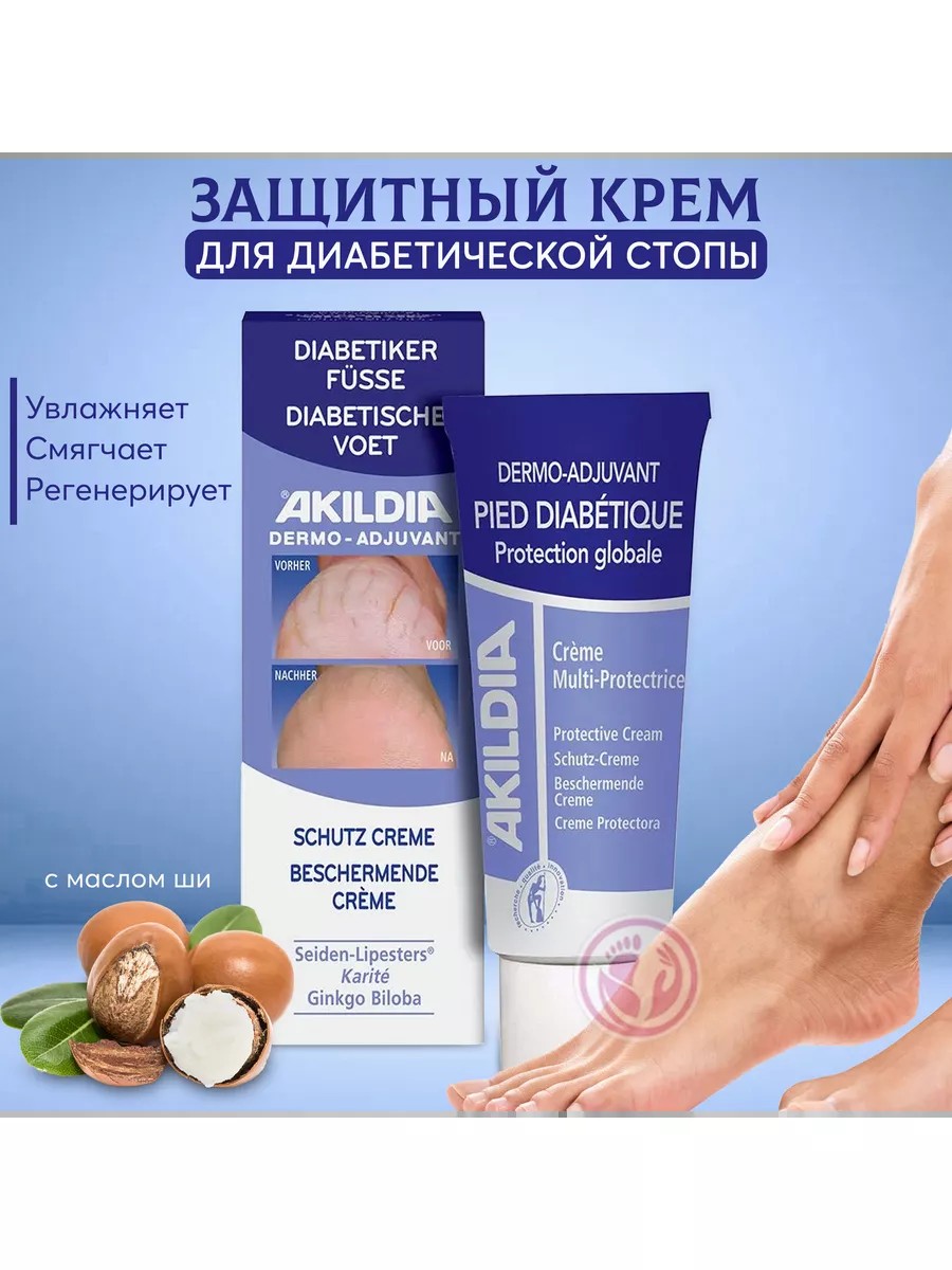 Защитный крем для стоп AkilDia Акилайн Akileine был специально разработан для ухода за диабетической стопой. Очень часто стопы диабетиков страдают от сильной сухости кожи и связанным с ней гиперкератозом (шелушением, образованием мозолей). Все это делает кожу уязвимой и снижает эффективность ее основной функции – барьерной. Крем «Акилдиа» обеспечивает защиту диабетической стопы от сухости, гиперкератоза, нарушений микроциркуляции, от бактерий и грибковых заболеваний. Насыщенный действующими веществами крем позволяет восстановить нормальное увлажнение кожных покровов и барьерную функцию кожи и устранить или значительно ослабить проявления гиперкератоза. Применяя крем два раза в день, Вы увидите, как постепенно с ног сойдут мозоли, кожа станет мягкой, перестанет шелушиться, пятки перестанут быть шершавыми, до них станет приятно дотронуться. Способ применения: наносить 2 раза в день на сухую чистую кожу стопы, массировать до полного впитывания. Особенно тщательно обрабатывать участки стопы, которые страдают от трения об обувь. Не наносить на поврежденные участи кожи и раны.