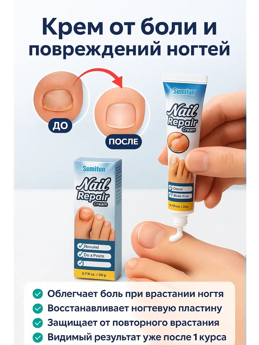 Крем от вросшего ногтя предназначен для снятия боли и восстановления повреждённой ногтевой пластины. Он помогает уменьшить воспаление, смягчить кожу и ускорить рост здорового ногтя. Средство активно применяется при утолщении, искривлении, покраснении и врастании ногтя. Облегчает болезненные ощущения в области ногтевой ложбинки и защищает от повторного врастания. Крем легко наносится, имеет комфортную текстуру, быстро впитывается и не оставляет следов. Подходит для мужчин и женщин, применяется как на ногтях ног, так и рук. Эффективен при повреждении ногтя после травмы, неудачного педикюра или деформации. Удобен для регулярного ухода, особенно при повышенной нагрузке на стопы и тесной обуви. Безопасен для чувствительной кожи, не вызывает раздражения. Регулярное применение способствует улучшению структуры ногтя, устранению болевого синдрома и восстановлению внешнего вида. Крем можно использовать в домашних условиях, а также брать с собой в дорогу. Подходит для ежедневного применения, курс лечения от 7 до 14 дней. Эффективен как в качестве лечебного, так и профилактического средства. Благодаря натуральным компонентам и сбалансированному действию помогает комплексно решать проблему вросших и воспалённых ногтей.