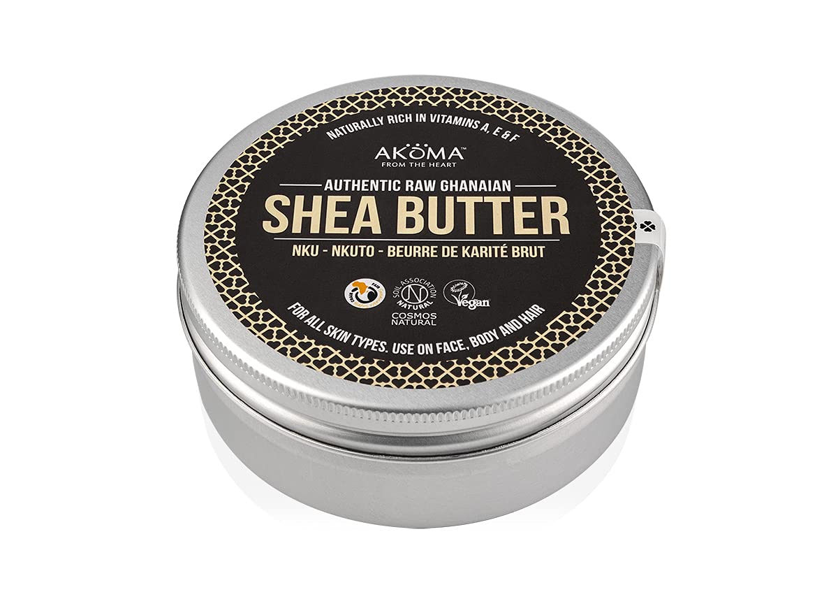 BOTANICAL NAMEButyrospermum Parkii EXTRACTION METHODTraditional hand pressed AROMANutty, Earthy SUGGESTED USE Cosmetic's and skincare BENEFITS Our Fairly Traded Authentic Raw Shea Butter- We are proud to confirm that our Shea butter products are certified cosmos natural from soil association. Our Fairly traded Raw Shea Butter is 100% unrefined, raw, natural and as beautiful as you can get it. It retains all its natural content (vitamins A, E, F, minerals, proteins and a fatty acid profile) to ensure that it is suitable for a variety of skin types. The benefits of our Fairly traded Authentic Raw Shea Butter- Our Raw Shea Butter naturally contains both vitamin A and E. Vitamin A is important for improving a number of skins conditions, including, blemishes, wrinkles, eczema and dermatitis. Vitamin E is a common anti-ageing ingredient that protects your skin. What is the source of our Fairly Traded Raw Shea Butter?Shea butter comes from the Karite tree, also known as women's gold. Who should use our Raw Shea Butter?Our Raw Shea Butter is suitable for a variety of skin types. What can you use our Fairtrade Raw Shea Butter for?Our Raw Shea Butter can be used to help ease a variety of skin conditions, including eczema, dermatitis, psoriasis, minor skin irritations, extreme dryness or toughness, stretch mark, burns, cuts and small skin wounds, sun burn, insect bites, ageing marks, fungal infections, scars, dandruff and many more. PRECAUTIONSFor external use only. A patch test is recommended, keep out of reach of children. This product can not be exempt from traces of nut or other allergens. All our product are made with 100% Authentic Raw Shea Butter from Ghana why don't you try our Organic Infused Shea Body Butter. INGREDIENTS Shea ButterYOUR PURCHASE SUPPORTS AFRICAN COMMUNITIES: We're proud of being Cosmos certified. Not only do you get the highest quality in unrefined Raw Shea Butter but you also provide a sustainable livelihood for Shea farmers in Ghana. INDULGE IN LUXURIOUS BODY BUTTER SPA EXPERIENCE RIGHT IN YOUR OWN HOME: Longing for a massage after a days work? instead of massage oil, let Akoma's silky rich Shea Butter drive you nuts when you slather it on as a face moisturiser or body cream. REJUVENATE DULL, DRY SKIN IN 7 DAYS: An excellent source of natural Vitamin E which contains anti-aging properties. Shea butter is commonly used as a moisturiser and anti-wrinkle cream as it hydrates skin cells to prevent fine lines and wrinkles. Apply to face and body daily. PAMPER YOUR SKIN WITH THE NATURAL VEGAN GOODNESS OF RAW SHEA BUTTER: Akoma delivers the finest organic extract from handpicked Shea nuts in Ghana, Africa - the original source of unrefined Shea Butter - without chemical or animal products.