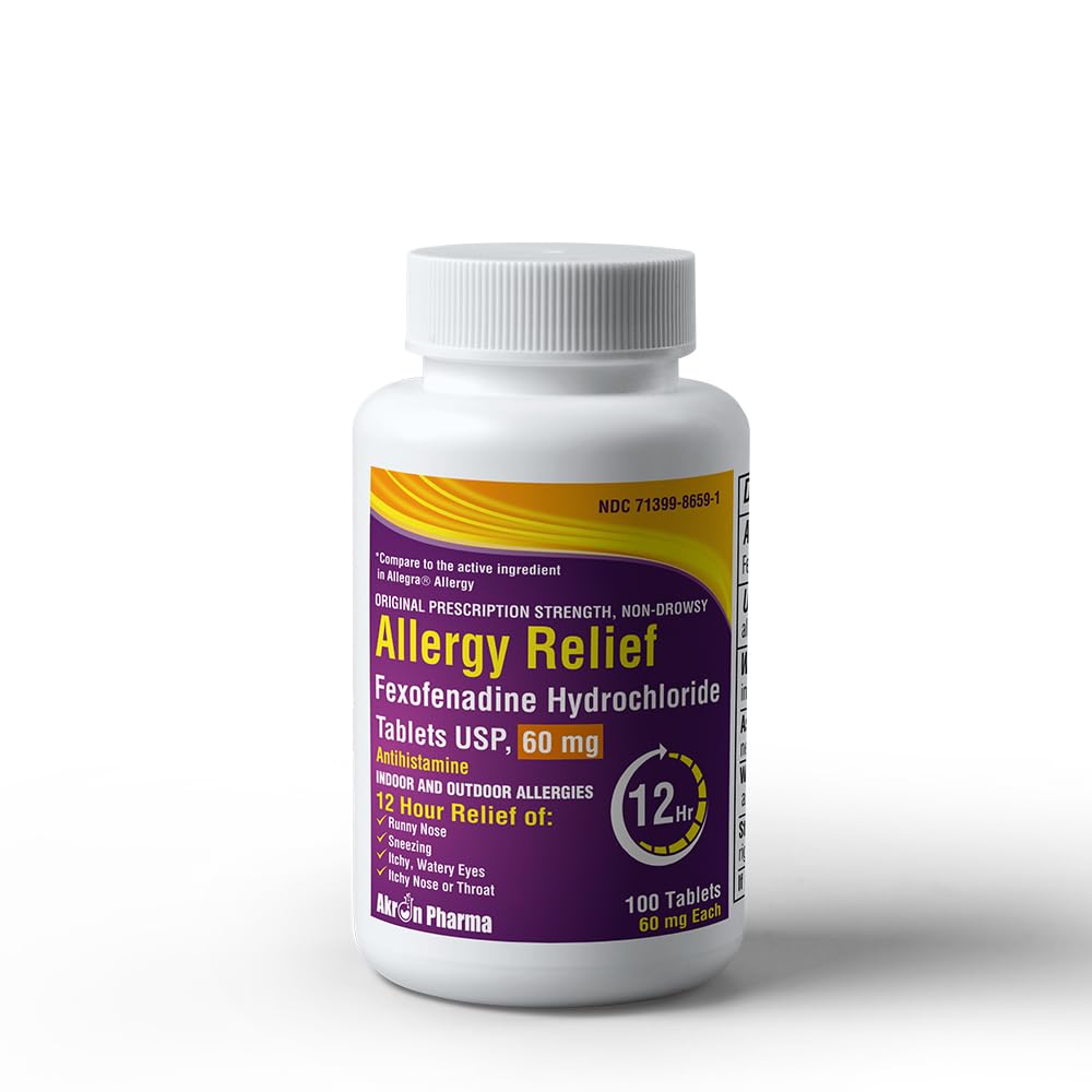 Convenient 100-Tablet Pack: Perfect for long-term use, offering 12-hour protection for allergy sufferers. Relieves Multiple Symptoms: Helps alleviate sneezing, itchy eyes, runny nose, and itchy throat caused by allergies. Effective for Indoor Outdoor Allergies: Reduces symptoms caused by hay fever, pollen, pet dander, dust mites, and mold. Powerful Antihistamine: Contains 60 mg of Fexofenadine Hydrochloride, a trusted active ingredient for allergy relief. 12-Hour Non-Drowsy Relief: Provides fast-acting, long-lasting relief from allergy symptoms without causing drowsiness.