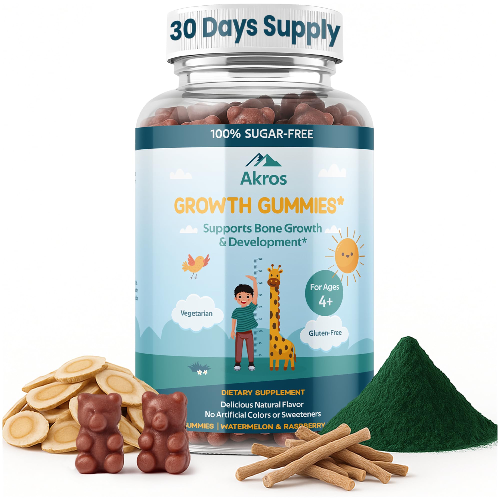 Akros Growth Gummies for Kids & Teens | Sugar-Free Calcium + Vitamin D3 & K2 Gummies - Height & Bone Support | Ashwagandha Spirulina L-Arginine | Non-GMO Gluten-Free 60 Raspberry-Watermelon Bears