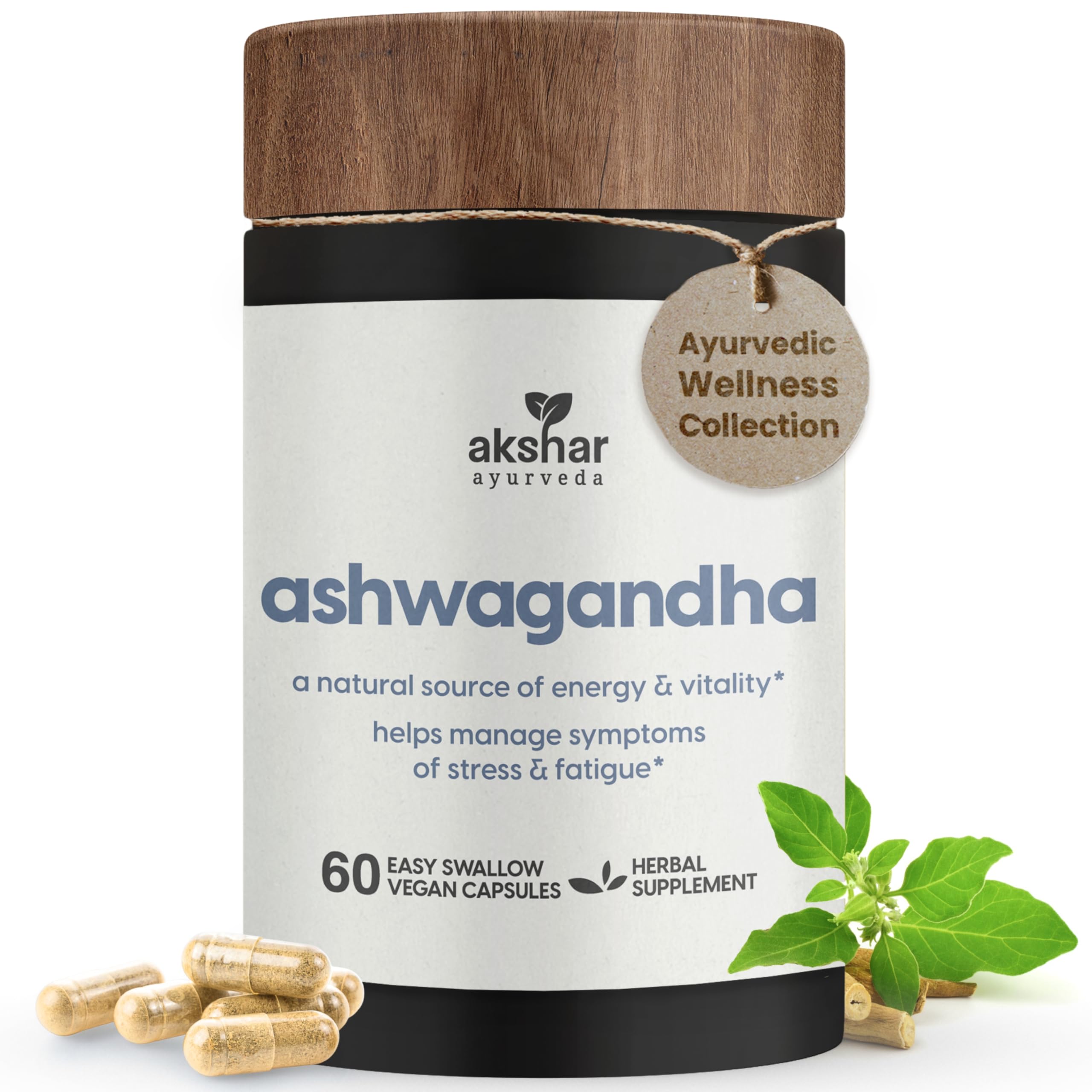 AKSHAR Ayurveda - Ashwagandha Capsules with Ashwagandha Root Extract and Powder - Adaptogenic Herbal Support - Vegan Cruelty-Free Ashwagandha Supplements (60 Count)