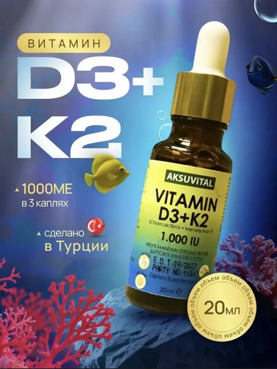 Vitamin D3 K2 от турецкого бренда Aksu Vital - биологически активная добавка к пище, которая стала незаменимой для поддержания общего здоровья и хорошего самочувствия. Витамин Д3 укрепляет иммунитет, отвечает за кальций и фосфор в организме, что жизненно важно для костей и зубов. К2 играет ключевую роль в регулировании обмена минерала, предотвращая его оседание в тканях и сосудах. Бады способствуют снижению вероятности образования и развития остеопороза, улучшению физической выносливости и настроения. Положительно влияют на состояние кожи, сердца, нервной системы и работу головного мозга. Д3К2 полезен для взрослых мужчин, женщин и подростков. Пищевой продукт произведен в Турции и соответствует высоким стандартам качества. Представлен в виде капель в удобном флаконе. С помощью пипетки получается равномерно дозировать капельки бада. Товар в жидкой форме актуален для женской и мужской аудитории. Беременным девушкам, кормящим мамам и детям, перед началом приема, следует проконсультироваться с врачом. Заказывайте витаминный комплекс D3K2 прямо сейчас и будьте энергичными и здоровыми каждый день