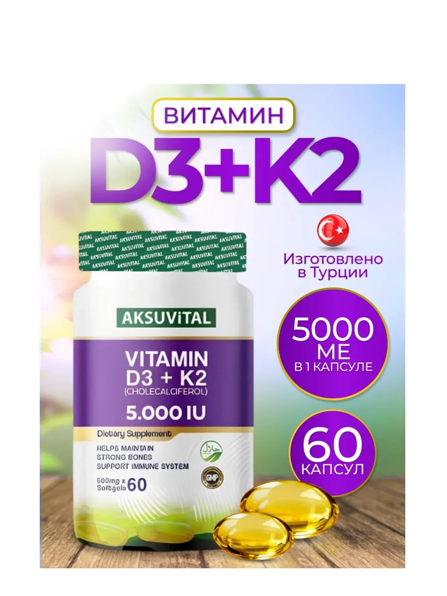 Дз К2 в форме капсул имеет важные функции в организме человека. Вся продукция турецкого бренда Aksu Vital, в том числе и препарат витаминный комплекс D3 К2, не содержат вредных веществ и добавок, произведены без красителей, подсластителей и искусственных ароматизаторов, а также без добавления сахара. Бад с Vitamin Д3 с К2 предлагает удобное и безопасное использование для взрослых в виде удобных для глотания капсул. D уменьшает риск нарушения осанки из-за мышечной слабости. Пищевая добавка д3к2 5000 способствует сохранению нормальных костей. Вит дЗ к2 нормализует уровень кальция в крови и является помощником для поддержания естественной функции мышц. Эффективный комплекс для защиты ваших зубов. Помогает всасыванию и употреблению кальция и фосфора и функционированию иммунной системы. Играет важную роль в делении клеток. D и К в составе продукта для сохранения костей. Новый натуральный и эффективный комплекс для поддержки работы мозга представляет пищевую добавку. Оригинальный препарат, имеющий сертификат качества и мировое имя. D3 + К2
