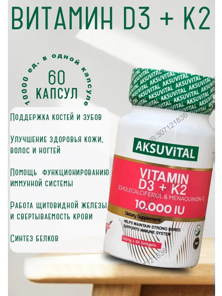 For children and adolescents, it helps promote skeletal growth and development, and improves memory and attention. The main function of D3 K2 is to regulate calcium and phosphorus levels. It also promotes protein synthesis, which is essential for strengthening muscles, nerve cells, and the brain. This product is recommended for pregnant and lactating women only under the advice of a specialist. Before use, consult a doctor to determine the correct dosage for you. Turkish quality is characterized by high bioavailability and rapid action. This vitamin is intended for adults, adolescents, and children during periods of low solar activity. For severe deficiency, take 2 capsules (10 IU). Take care of your health with Aksu Vital!