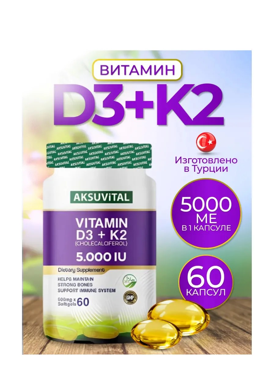 Витамин Д относится к группе Витаминов и Бадов. дз К2 в форме капсул имеет важные функции в организме человека. Вся продукция турецкого бренда Aksu Vital, в том числе и препарат витаминный комплекс D3 К2, не содержат вредных веществ и добавок, произведены без красителей, подсластителей и искусственных ароматизаторов, а также без добавления сахара. Бад с Vitamin Д3 с К2 предлагает удобное и безопасное использование для взрослых в виде удобных для глотания капсул. D уменьшает риск нарушения осанки из-за мышечной слабости. Пищевая добавка д3к2 5000 способствует сохранению нормальных костей. Вит дЗ к2 нормализует уровень кальция в крови и является помощником для поддержания естественной функции мышц. Эффективный комплекс для защиты ваших зубов. Помогает всасыванию и употреблению кальция и фосфора и функционированию иммунной системы. Играет важную роль в делении клеток. D и К в составе продукта для сохранения костей. Новый натуральный и эффективный комплекс для поддержки работы мозга представляет пищевую добавку. Оригинальный препарат, имеющий сертификат качества и мировое имя. D3 + К2