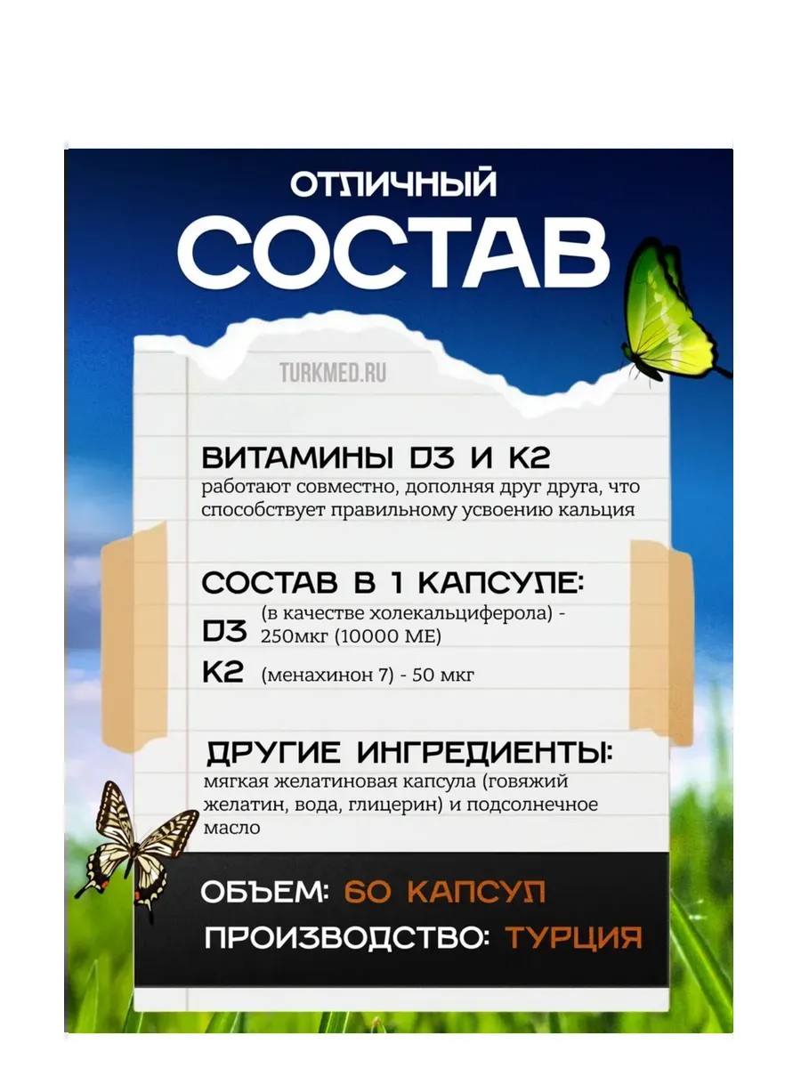 | Состав | Витамин К2; масло подсолнечника; глицерин; холекальциферол; витамин д3 |