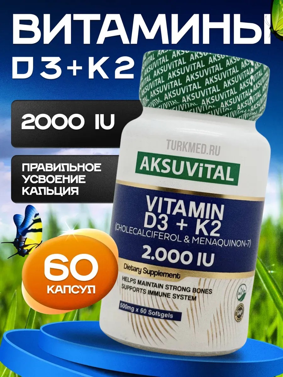 Vitamin D belongs to the group of vitamins and dietary supplements. D3 K2 in capsule form plays important roles in the human body. All products of the Turkish brand Aksu Vital, including the vitamin complex D3 K2, are free of harmful substances and additives. They are produced without colorants, sweeteners, artificial flavors, or added sugar. Vitamin D3 with K2 offers convenient and safe use for adults in easy-to-swallow capsules. D reduces the risk of postural problems due to muscle weakness. The dietary supplement D3 K2 2000 helps maintain normal bones. Vitamin D3 K2 normalizes blood calcium levels and helps maintain natural muscle function. An effective complex for protecting your teeth. It promotes the absorption and utilization of calcium and phosphorus, as well as the functioning of the immune system. It plays an important role in cell division. D and K are included in the product for bone preservation. A new natural and effective complex for supporting brain function is a dietary supplement. This original product is certified for quality and has a worldwide reputation. Vitamin D3 + K2 is an easily digestible form of D and K. This complex of micronutrients is essential for calcium absorption, strong bones, and healthy teeth, blood vessels, and the heart. Vitamin D3 K2 2000 IU is produced using MCT oil, which is a source of fatty acids necessary for the normal functioning of all body systems. Daily intake will help replenish essential vitamins, improve health, and feel more energetic. This sunshine vitamin helps absorb calcium and phosphorus and strengthens bones, increases vitality, and improves mood. K complements D, ensuring proper interaction with calcium. The micronutrient also activates protein synthesis, which supports heart function, strengthens the nervous system, is involved in metabolism, and supports kidney function. Directions for use: Take 1 capsule every 3 days. One drop contains 2000 IU of D and 50 mcg of K. Give yourself or a loved one a gift at an attractive price. Join us, leave your feedback and comments! Stay healthy with us!