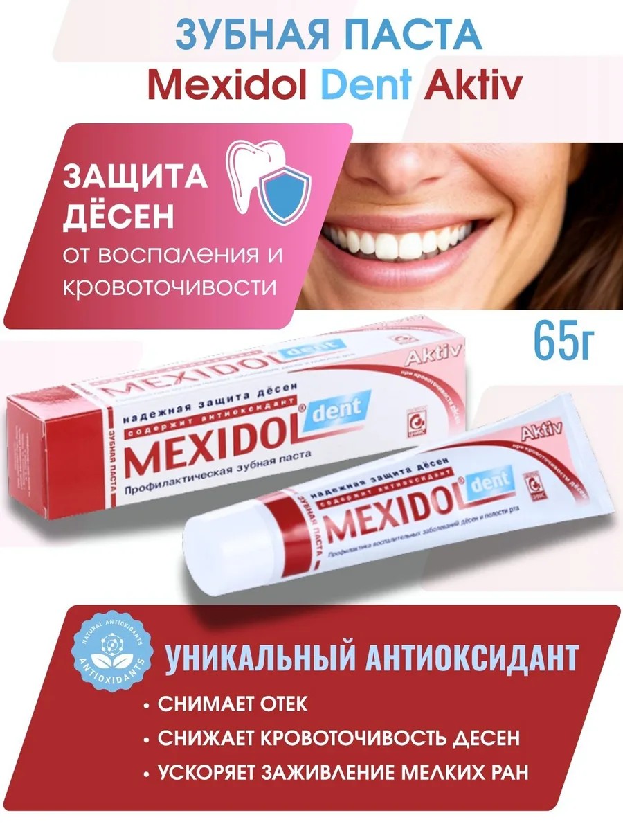 Зубная паста Mexidol Dent Aktiv - это лечебно-профилактическая зубная паста с ксилитом. Мексидол Дент Актив Содержит в своем составе уникальный антиоксидант, который восстанавливает микроциркуляцию крови в деснах, снимает отек, снижает кровоточивость десен и ускоряет заживление мелких ран.