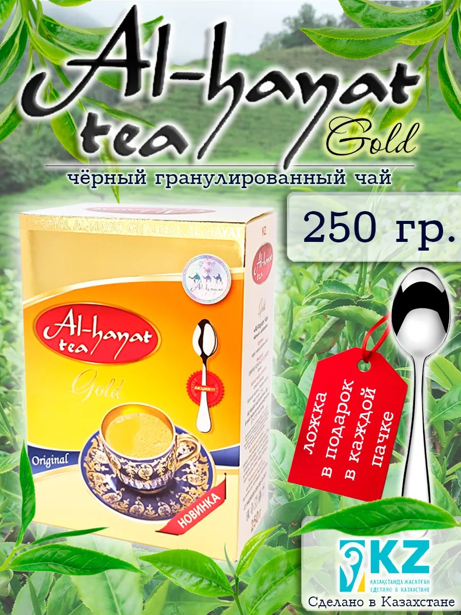 Al-Hayat Gold Granulated Tea + Free Spoon! Premium grade, original premium tea, 1 pack of 250g. Also known as "Pakistani" or "Kazakhstani." A taste that will amaze you from the first cup! A special type of tea leaves provides a bright and beautiful color. Perfect for making hot and cold tea drinks with milk. Tea brewed in a cup is a great alternative to tea bags; the granules swell and settle to the bottom of the cup, not interfering with your drinking experience. Black tea is a wonderful drink that refreshes and delights with its taste. Al-Hayat is aromatic, made from high-quality raw materials and natural ingredients. AI-HAYAT removes harmful substances from the body. It has amazing healing properties. It is an excellent choice for those who care about their health and want to strengthen their immune system, as well as for those trying to lose weight. Unlike loose leaf tea, granulated tea brews much faster. Many people report that just one cup of black spiced tea noticeably lifts their spirits, no matter how difficult the day. Traditionally, Pakistani tea is prepared with milk, sugar, cinnamon, lemon, or honey. Black tea is a healthy food product. Delicious, it can have both a tonic and calming effect. It's economical to consume, and contains no additives or blends. Pakistanis believe that drinking tea activates vital energy. Ayurveda also recommends regular consumption of this spiced beverage. Alhayat Superfood granulated tea makes a wonderful gift for birthdays and holidays. This gift set will delight your mom, dad, sister, grandma, grandpa, girlfriend, husband, friend, colleague, teacher, boyfriend, or girlfriend. Brew it in a stylish teapot and serve it in elegant teapots – this will add a special atmosphere to your tea party and create unforgettable moments. This tea brings people together, and it makes a wonderful gift for your friends and family. They will appreciate your thoughtfulness and attention, and you can share this exquisite drink with them on holidays or cozy evenings. Don't miss the opportunity to make every moment special with our Al-Hayat black tea set in granulated form. Treat yourself and your loved ones to the true taste and aroma of Kazakh tea in granulated form. Perhaps you're looking for a tea similar to Al Jannat. AlHayat is grown in Kenya. Packaged in Kazakhstan. Each Al Khanat Gold package includes a complimentary teaspoon.