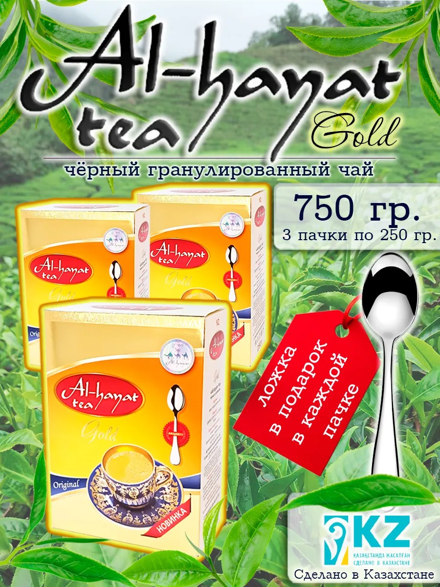 Al-Hayat Gold Granulated Tea + Free Spoon! Premium quality, original premium tea. The set includes 3 packs of tea, 250 grams each. It is also called "Pakistani" or "Kazakhstani." A taste that will amaze you from the first cup! A special type of tea leaves provides a bright and beautiful color. It is perfect for making hot and cold tea drinks with milk. Tea brewed in a cup is a great alternative to tea bags; the granules swell and settle to the bottom of the cup, not interfering with drinking. Black tea is a wonderful drink that refreshes and delights with its taste. Al-Hayat is aromatic, made from high-quality raw materials and natural ingredients. AI-HAYAT removes harmful substances from the body. It has amazing healing properties. It is an excellent choice for those who care about their health and want to strengthen their immune system, as well as for those trying to lose weight. Unlike loose leaf tea, granulated tea brews much faster. Many people report that just one cup of black spiced tea noticeably lifts their spirits, no matter how difficult the day. Traditionally, Pakistani tea is prepared with milk, sugar, cinnamon, lemon, or honey. Black tea is a healthy food product. Delicious, it can have both a tonic and calming effect. It's economical to consume, and contains no additives or blends. Pakistanis believe that drinking tea activates vital energy. Ayurveda also recommends regular consumption of this spiced beverage. Alhayat Superfood granulated tea makes a wonderful gift for birthdays and holidays. This gift set will delight your mom, dad, sister, grandma, grandpa, girlfriend, husband, friend, colleague, teacher, boyfriend, or girlfriend. Brew it in a stylish teapot and serve it in elegant teapots – this will add a special atmosphere to your tea party and create unforgettable moments. This tea brings people together, and it makes a wonderful gift for your friends and family. They will appreciate your thoughtfulness and attention, and you can share this exquisite drink with them on holidays or cozy evenings. Don't miss the opportunity to make every moment special with our Al-Hayat black tea set in granulated form. Treat yourself and your loved ones to the true taste and aroma of Kazakh tea in granulated form. Perhaps you're looking for a tea similar to Al Jannat. AlHayat is grown in Kenya. Packaged in Kazakhstan. Each Al Khanat Gold package includes a complimentary teaspoon.