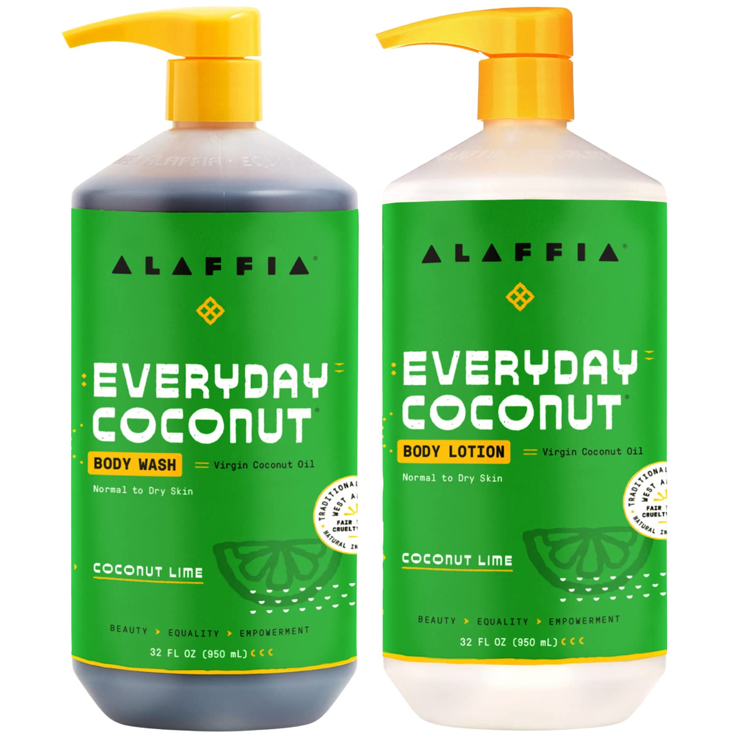 Alaffia EveryDay Coconut Hydrating Body Lotion and Body Wash - Normal to Dry Skin Moisturizing Support for Soft & Supple Skin Moisturizes and Cleanses Toxins and Grime Coconut Lime 32 Fl Oz Each