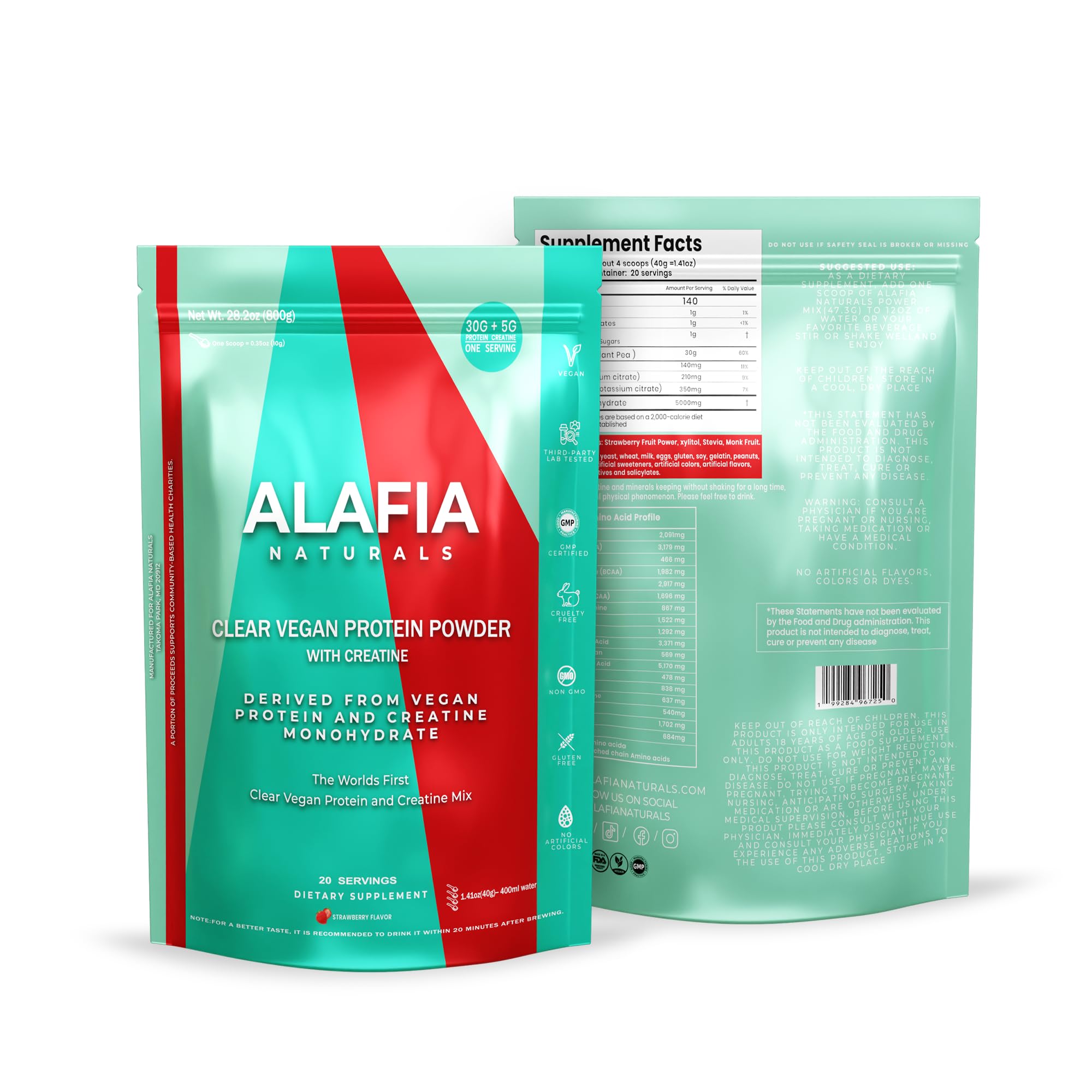 A protein so refreshing it practically belongs in a cooler. With 30g of crisp, clean plant protein in every serving, this light fruit-forward drink blurs the line between beach day and training day. No heaviness. No grit. Just pure, tasty fuel. But what exactly is "clear protein"? Short answer: Protein that tastes like fruit juice. Long answer: A refined plant protein processed to reduce thickness and bitterness, creating a clear, smooth base perfect for bright flavors. This improves absorption, keeps digestion easy, and supports muscle repair, recovery, and performance—without the typical protein shake aftertaste. Sip, recover, repeat.YOUR COMPLETE PROTEIN POWDER: Get 20 servings of clear, smooth, plant-based protein with creatine crafted for optimal hydration and recovery. Refreshing and easy to drink—ideal for summer training, outdoor sessions, or poolside sipping. Say goodbye to bloating with a non-dairy strawberry flavor formula designed for smooth digestion and efficient nutrient absorption. Alafia Naturals uses only clean, plant-based ingredients—no fillers, no sugar—to help minimize inflammation, support gut comfort, and keep skin breakout-free. Support faster recovery and less soreness with our clean formula powered by BCAAs, electrolytes, and a complete amino acid profile—leucine, lysine, valine, proline, arginine, tyrosine, and more. A sugar-free, plant-based protein designed to fuel every training session. Experience elevated performance with creatine monohydrate and leucine, working together to drive powerful muscle gains, strength, and recovery. This vegan protein is formulated for athletes who demand clean fuel, peak results, and a formula that supports serious progress. 30g of clean plant protein plus 5g creatine and essential BCAAs in every scoop. A complete amino acid profile, zero sugar, and ultra-clean ingredients to help you perform better and recover faster.