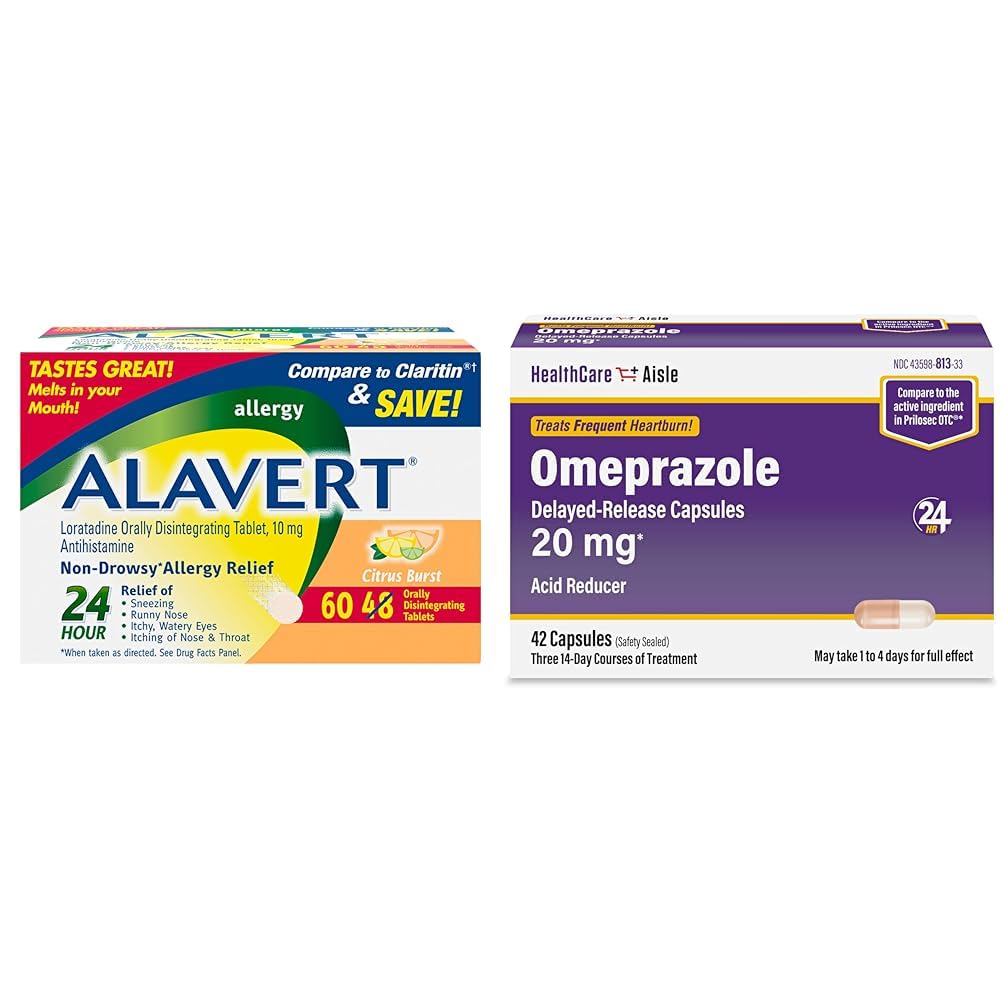 Trusted Active Ingredients - Alavert contains loratadine and HealthCareAisle contains omeprazole, the same active ingredients found in national brand allergy and heartburn medicines. Available Without a Prescription - The Alavert allergy and HealthCareAisle heartburn relief medicines are available over-the-counter without a doctor's prescription. Easy to Take - Alavert allergy tablets dissolve instantly in your mouth without water, while the omeprazole capsules can be swallowed easily to manage heartburn. Fast-Acting Heartburn Relief - HealthCareAisle omeprazole capsules work in 1-4 days to relieve frequent heartburn occurring 2 or more days a week. 24 Hour Allergy Relief - Alavert tablets provide 24 hours of relief from indoor and outdoor allergy symptoms including sneezing, runny nose, watery eyes, and itchy throat.