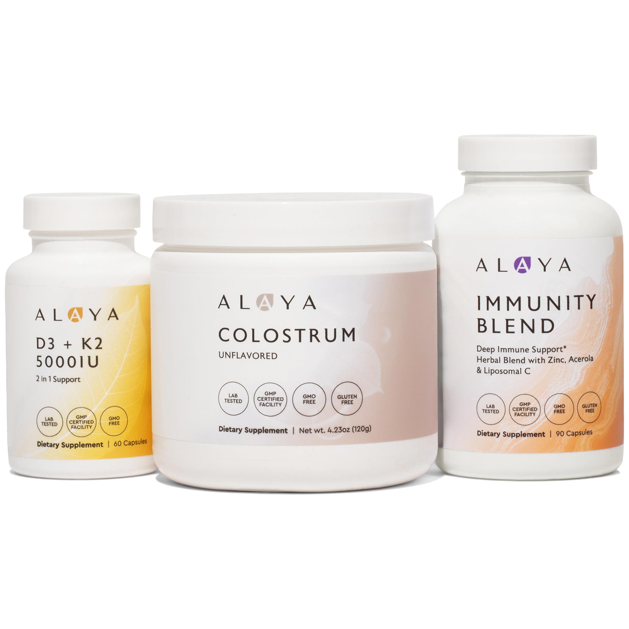 Simple Daily Routine: The Immunity Starter makes it easy to stay consistent with your wellness goals. Perfect for those looking for a no-fuss, daily immune support routine. . Bone Strength Nutrient Absorption: D3 K2 provides essential nutrients that work together to help support calcium absorption and bone health for everyday wellness. Third-party tested for quality. . Gut Digestive Balance: High-quality bovine colostrum helps support gut lining integrity and immune health. Immune Support: A mix of vitamins, minerals, and botanicals helps support your body's natural defenses and overall vitality. . Daily Immune Wellness Support. A trio of essentials that help support immune function, gut balance, and bone health year-round featuring Alaya Immunity Blend, Colostrum, and D3 K2. .