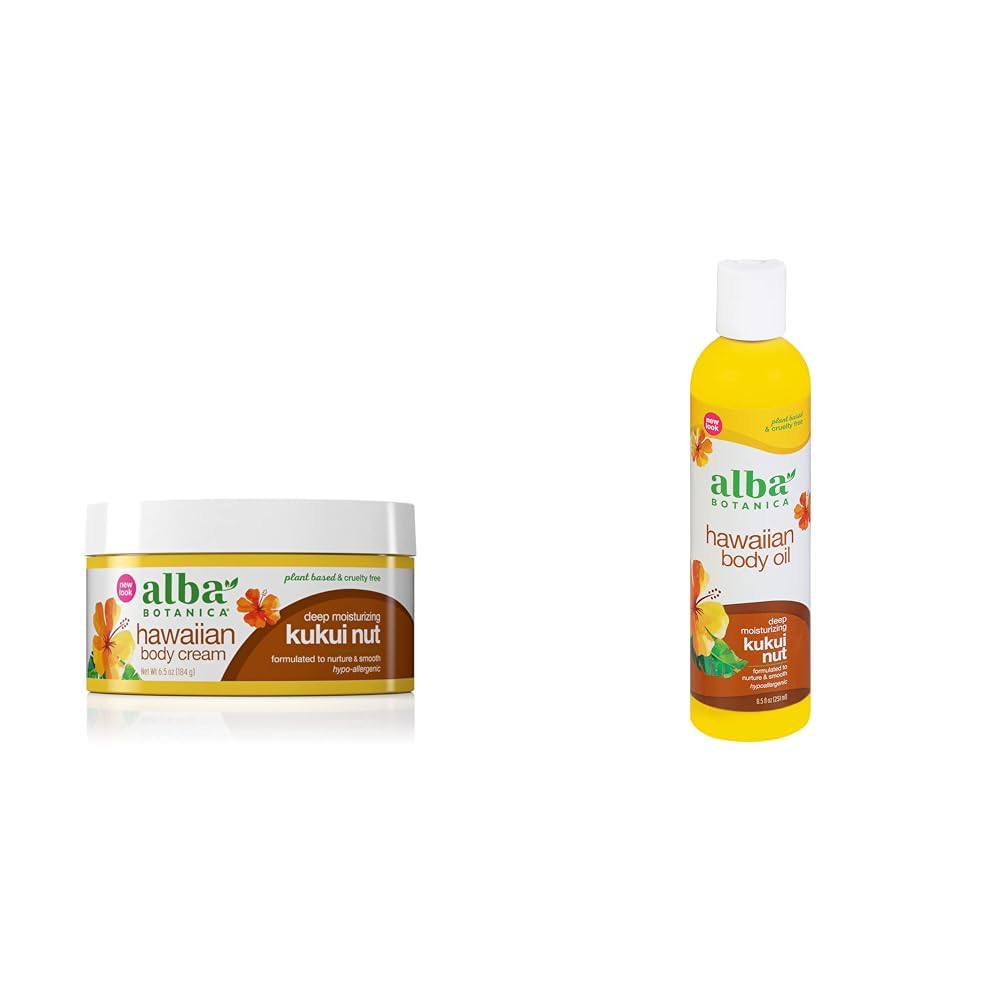 Kukui nut softens and nurtures skin. One 8.5 oz. bottle of Alba Botanica Hawaiian Deep Moisturizing Kukui Nut Body Oil. 100 vegetarian formula made without harsh ingredients like parabens, phthalates or harsh sulfates. Made with a plant-based blend of botanical extracts like vanilla, cucumber and arnica. Kukui nut softens and nurtures skin. One 6.5 oz. jar of Alba Botanica Deep Moisturizing Kukui Nut Hawaiian Body Cream.