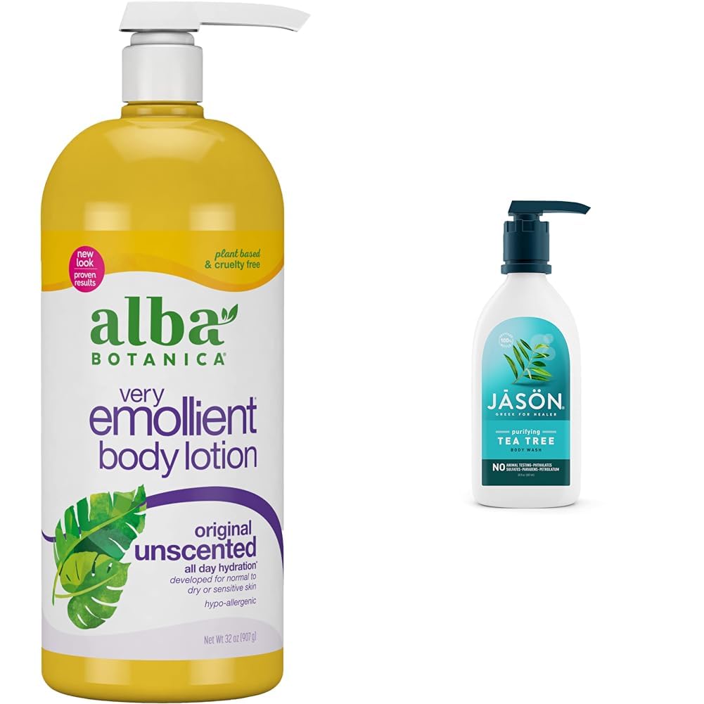 Alba Botanica Very Emollient Body Lotion, Unscented Original, 32 Oz Moisturize and nourish sensitive skin with Alba Botanica Very Emollient Original Unscented Body Lotion. Made with botanical emollients such as shea butter, avocado oil and jojoba seed oil, this rich lotion hydrates and softens dry skin without a heavy or greasy feeling. Aloe, cucumber extract and chamomile soothe and calm skin. Our 100 vegetarian formula is hypo-allergenic and does not contain any parabens, phthalates or synthetic fragrances. It is also not tested on animals. Jason Natural Body Wash Shower Gel, Purifying Tea Tree, White, 30 Fl Oz (Pack of 1) Gently cleanse and nourish your skin with Jason Purifying Tea Tree Body Wash. Infused with nutrient-rich vitamin E and pro-vitamin B5, plus purifying tea tree oil and soothing aloe vera, our gentle body wash moisturizes and hydrates skin, leaving skin feeling soft, smooth and balanced. Our biodegradable formula is made with safe, gentler and effective ingredients and contains no parabens, harsh sulfates, phthalates or petrolatum. It is also not tested on animals. The Jason brand believes in the power of nature's ingredients to improve everyday wellness. We were pioneers of safer, wholesome personal care, and we continue to harness the earth's bounty of botanicals and essentials for blends that refresh and restore. Wellness is our second nature, and it has been since 1959.