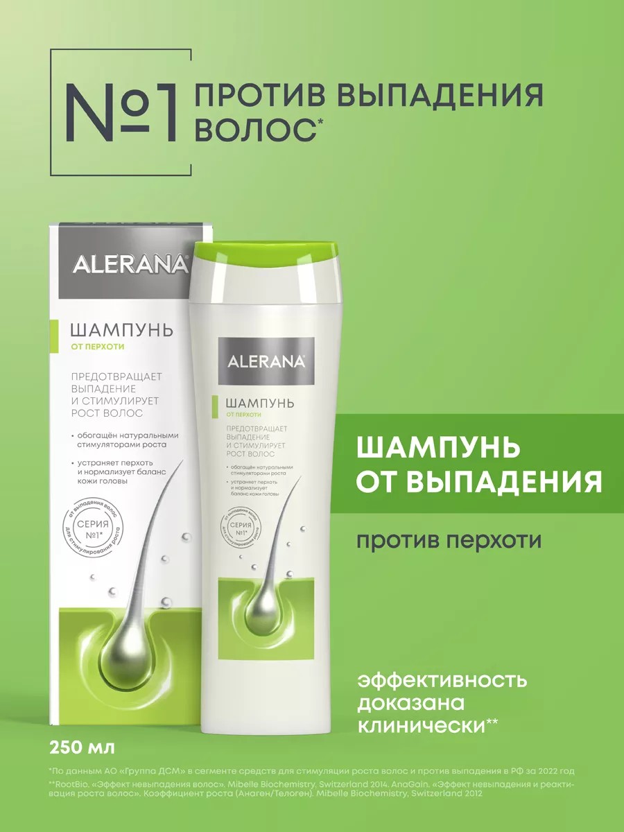 Шампунь ALERANA против перхоти обеспечивает бережный уход и оказывает выраженное действие.Он создан на основе тщательно подобранных ингредиентов, активно взаимодействующих между собой.Комбинация активных компонентов в шампуне ALERANA помогает устранить перхоть и способствует стимулированию роста ослабленных волос.Косметическое средство оказывает увлажняющий, успокаивающий и очищающий эффект.Действующее вещество шампуня - Пироктон Оламин устраняет причину появления перхоти: компонент блокирует размножение грибка, вызывающего перхоть, устраняет шелушение кожи головы и увеличивает доступ кислорода к волосяным луковицам, способствуя росту здоровых волос.Декспантенол успокаивает раздраженную кожу головы и восстанавливает структуру волоса.Растительные стимуляторы роста волос с доказанной клиническими исследованиями эффективностью AnaGain и RootBio, воздействуют на волосяные фолликулы, улучшают питание корней, активизируют рост волос.Коэффициент роста волос +78%.Уменьшение потери волос на 31%.Результат: крепкие волосы и здоровая кожа головы без перхоти и зуда, укрепление волос и предотвращение их выпадения.Уходовая косметика с натуральными лечебными экстрактами - активаторами роста в составе подходит для очистки сухих и жирных, нормальных, кудрявых и гладких, окрашенных, вьющихся, тонких, секущихся, поврежденных, пористых, темных и светлых, пушистых, волнистых, густых волос, независимо от их длины и густоты, а также проблемной кожи головы.Косметическое средство с укрепляющим, стимулирующим эффектом предназначено для использования в домашних условиях, но по достоинству будет оценено даже профессиональными парикмахерами, пригодится в дороге.Небольшое количество шампуня нанести на влажные волосы, интенсивно помассировать кожу головы и оставить не менее чем на 3 минуты, затем смыть теплой водой.Максимальный результат достигается при регулярном применении.Для достижения наилучшего эффекта после применения шампуня рекомендуется использовать бальзам-ополаскиватель ALERANA.
