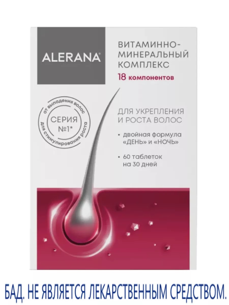 The Alerana vitamin and mineral complex is an additional source of vitamins, amino acids, and minerals (macro- and microelements) necessary for strengthening and growing healthy hair, improving the condition of the scalp in women and men, and preventing split ends and hair loss. Alerana vitamins contain: vitamin C, vitamin E, vitamin D3, vitamin B1, vitamin B2, vitamin B6, vitamin B12, biotin, beta-carotene, folic acid, pantothenic acid, iron, chromium, selenium, and zinc. The ALERANA brand is a series of products designed to prevent hair loss, stimulate growth, and strengthen and improve the condition of hair. The Alerana vitamin and mineral complex is an additional source of vitamins, amino acids, and minerals (macro- and microelements) necessary for strengthening and growing healthy hair, preventing hair loss and split ends, and improving the condition of the scalp in women and men. The active ingredients in the Alerana Day and Night vitamin and mineral complex formulas are selected based on compatibility and synergistic action. The Alerana vitamin and mineral complex provides an additional source of vitamins, amino acids, and minerals (macro- and microelements) necessary for strengthening and growing healthy hair, preventing hair loss and split ends, and improving scalp condition in both women and men. The active ingredients in the Alerana Day and Night vitamin and mineral complex formulas are selected based on compatibility and synergistic action. Dosage: Formula “Day”: Vitamin C – 100 mg, Vitamin E – 40 mg, Magnesium – 25 mg, Iron – 10 mg, Beta-carotene – 5 mg, Vitamin B1 – 4.5 mg, Folic acid – 0.5 mg, Selenium – 0.07 mg, Pantothenic acid – 12 mg, Vitamin B2 – 6 mg, Vitamin B6 – 6 mg, Biotin – 0.12 mg, Vitamin B12 – 0.007 mg. Formula "Night": Vitamin B1 - 5 mg, Folic acid - 0.6 mg, L-cystine - 40 mg, Zinc - 15 mg, Pantothenic acid - 15 mg, Vitamin B2 - 6 mg, Vitamin B6 - 6 mg, Nettle extract (contains silicon) 71 mg, Vitamin D3 - 0.0025 mg, Biotin - 0.15 mg, Chromium - 0.05 mg, Vitamin B12 - 0.009 mg. PHARMACOLOGICAL ACTION: provides hair follicles with substances necessary for growth and development, reduces hair loss, improves the condition of hair and scalp, promotes healthy shine, has a general strengthening antioxidant effect. Action: Vitamin C (ascorbic acid) increases capillary tone, improves microcirculation in the scalp, ensures the delivery of nutrients to the hair follicles. Vitamin E (tocopherol) maintains skin elasticity and health, transporting oxygen and nutrients to the hair follicles. Magnesium is involved in protein, carbohydrate, and fat metabolism, promotes vasodilation, improves hair nutrition, and adds elasticity and volume. Iron is involved in oxidation processes and oxygen transport to all cells in the body. It participates in cell division during hair follicle formation.