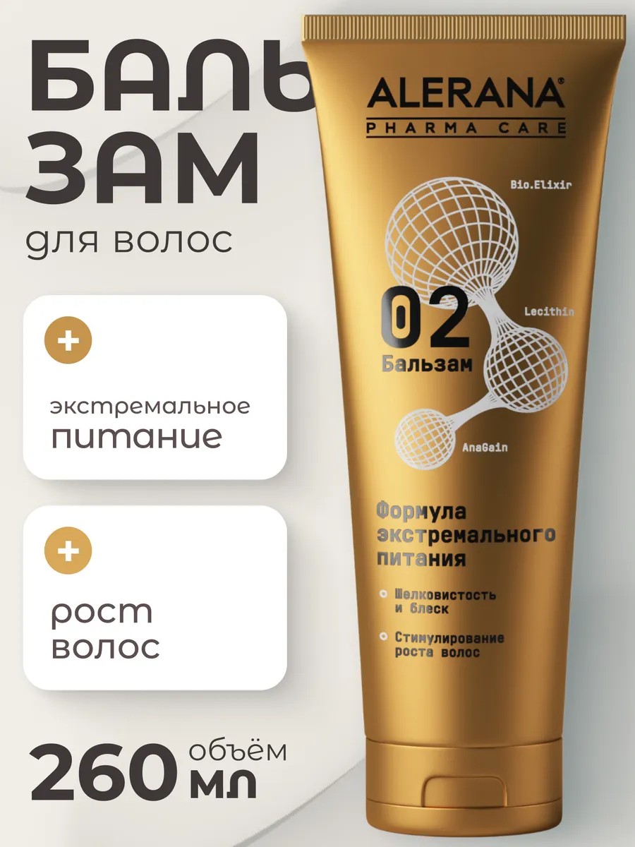 Alerana Pharma Care Nourishing Balm. This extreme nourishing formula is enriched with proven active ingredients. Results: 67% more shine and 76% more elasticity. The formula includes a Bio Elixir complex of 12 legendary oils: argan, shea, cottonseed, coconut, macadamia, myrrh, green tea extract, chamomile extract, aloe, calamus, olive, and cinnamon. It provides excellent scalp hydration. This professional product also contains Lecithin, which improves vitamin absorption and repairs damaged split ends, increasing elasticity and silkiness. AnaGain, a phytonutrient-rich ingredient, targets hair follicles and prevents hair loss by boosting cellular metabolism and activating growth by 78%. This restorative conditioner combats frizz and breakage, strengthens, and adds smoothness and beauty to curls. Suitable for color-treated, fine, oily, porous, frizzy, and unruly hair. This product facilitates combing and is ideal for daily use by both women and men. Directions: Cleanse scalp and apply to clean, damp hair for 3 minutes, then rinse with water. Alerana hair care products are formulated with high-quality ingredients and provide a softening and strengthening effect. This moisturizing conditioner makes a great gift for any women's holiday.