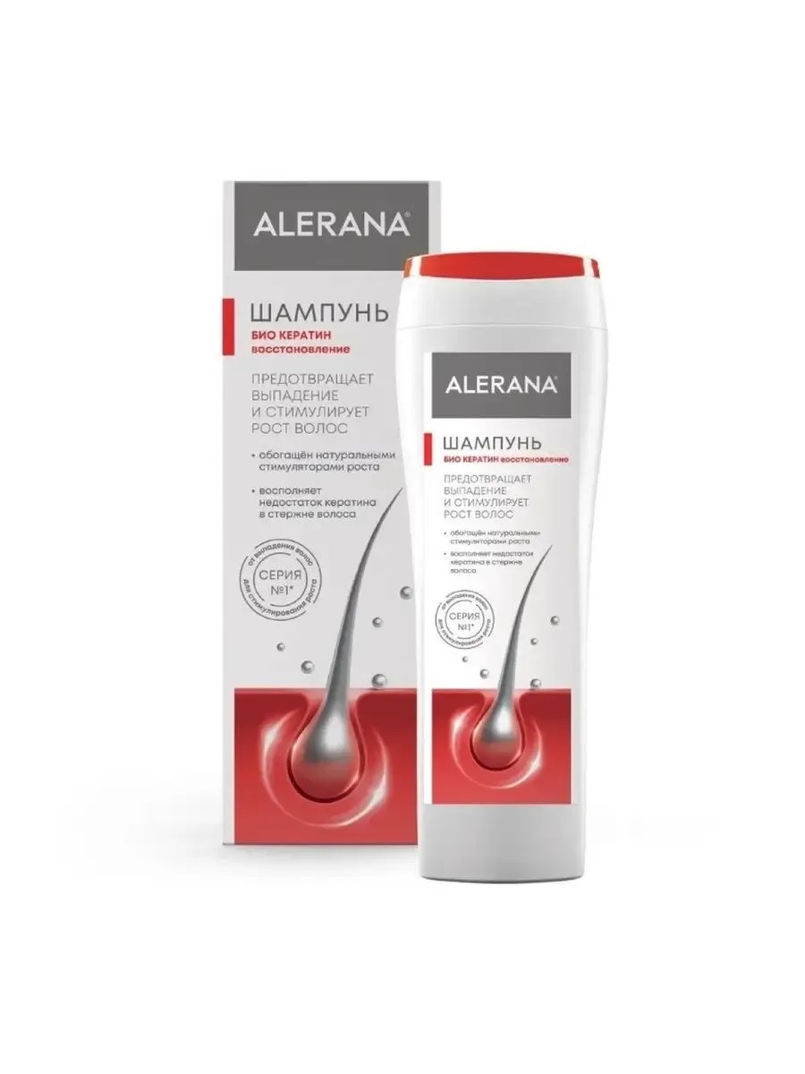 ALERANA, Шампунь био кератиновое восстановление, 250 мл. Шампунь бессульфатный Био Кератин для роста и от выпадения волос. Инновационный продукт серии ALERANA для восполнения недостатка кератина, устранения глубоких повреждений последовательность пептидов натурального кератина женского волоса, обеспечивая лучшее восстановление, обеспечивает направленное восстановление повреждений волос от корней до кончиков. Абиссинское масло усиливает блеск волос, снижает ломкость,облегчает расчесывание. Растительные стимуляторы роста волос AnaGain и RootBio, воздействуют на волосяные фолликулы, улучшают питание корней, активизируют рост волос. Коэффициент роста волос +78%. Уменьшение потери волос на 31%. Результат: глубокое точечное восстановление поврежденных волос от корней до кончиков. Уникальные рецептуры созданы под контролем трихологов и базируются на достижениях современной косметологии и фармакологии. ALERANA - не просто очищение и уход, это эффективное, осознанное оздоровление волос.