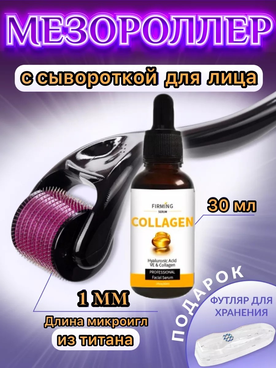 В комплекте мезороллер 1 мм с титановыми иглами и коллагеновая сыворотка 30 мл.