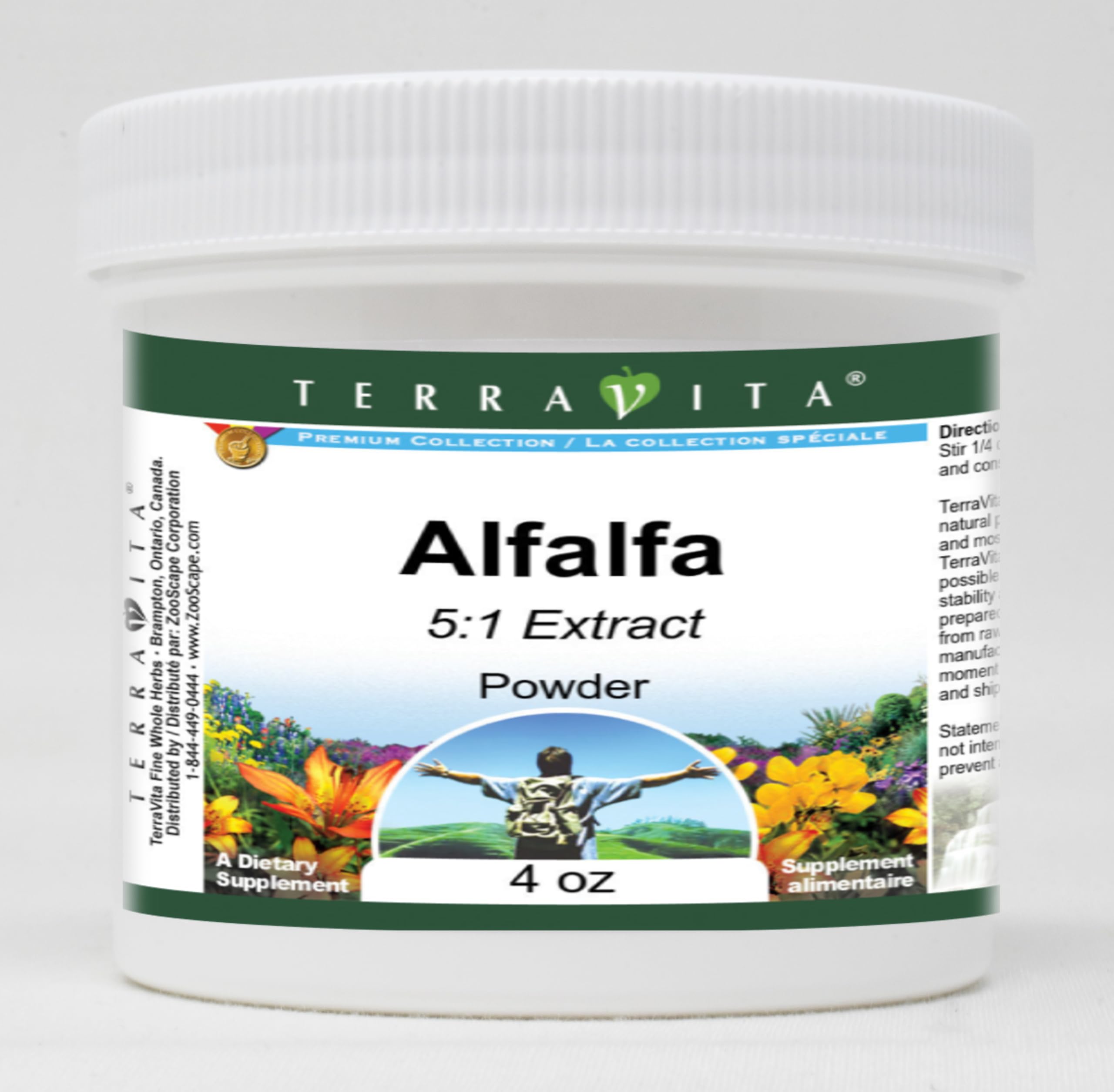 Alfalfa 5:1 Powder (4 oz, ZIN: 518839) Packaged in the United States in a GMP certified facility (Good Manufacturing Practice). No fillers. Manufacturer: TerraVita Size: 4 oz Convenient Powder format. Ingredients: Alfalfa 5:1 Extract