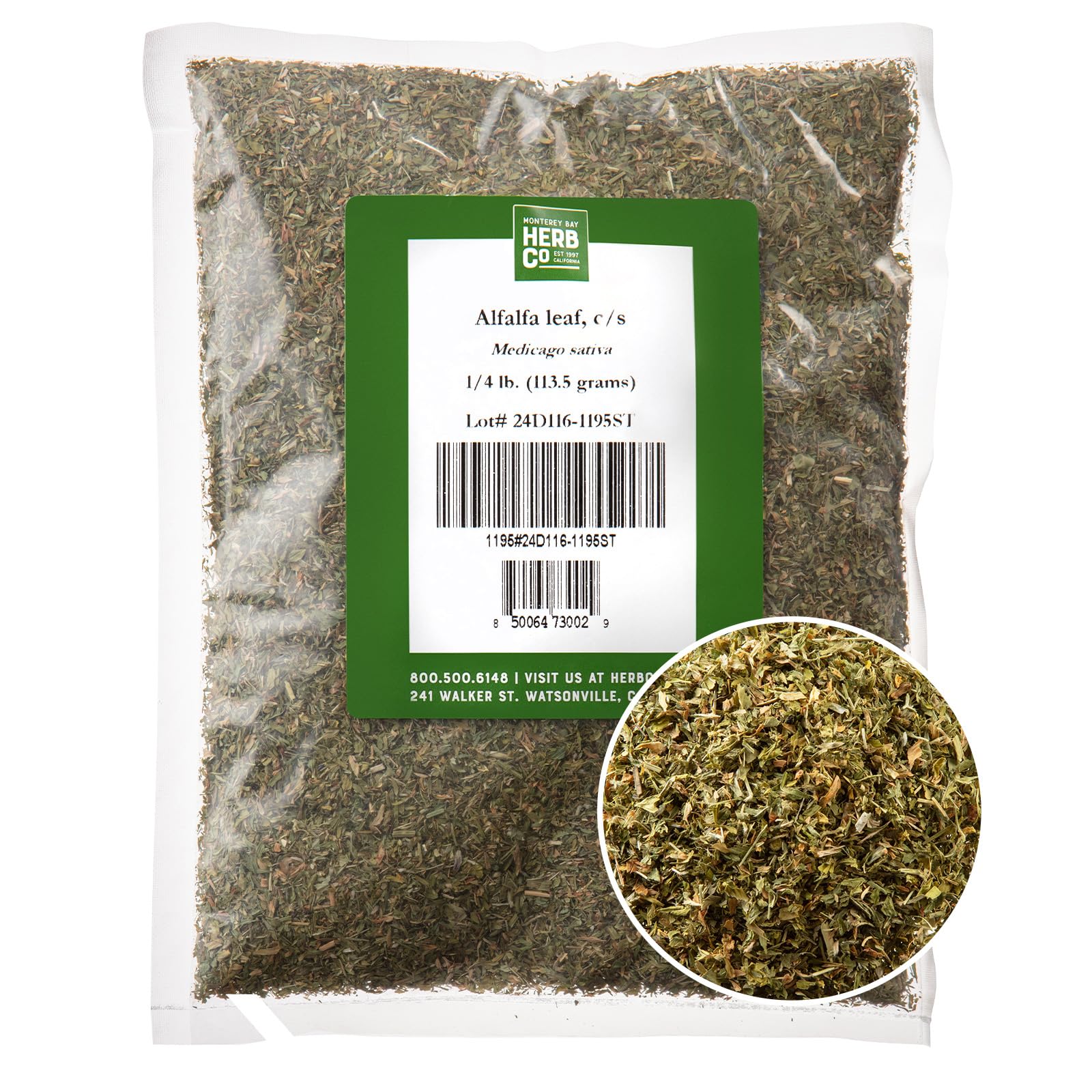 Alfalfa Leaf Cut & Sifted, by Herb Co, Kosher, Non-Irradiated, Non-GMO, for Herbal Oils, Used in Soups, Stews, Tea Blends, Earthly Flavor, 1/4 lb