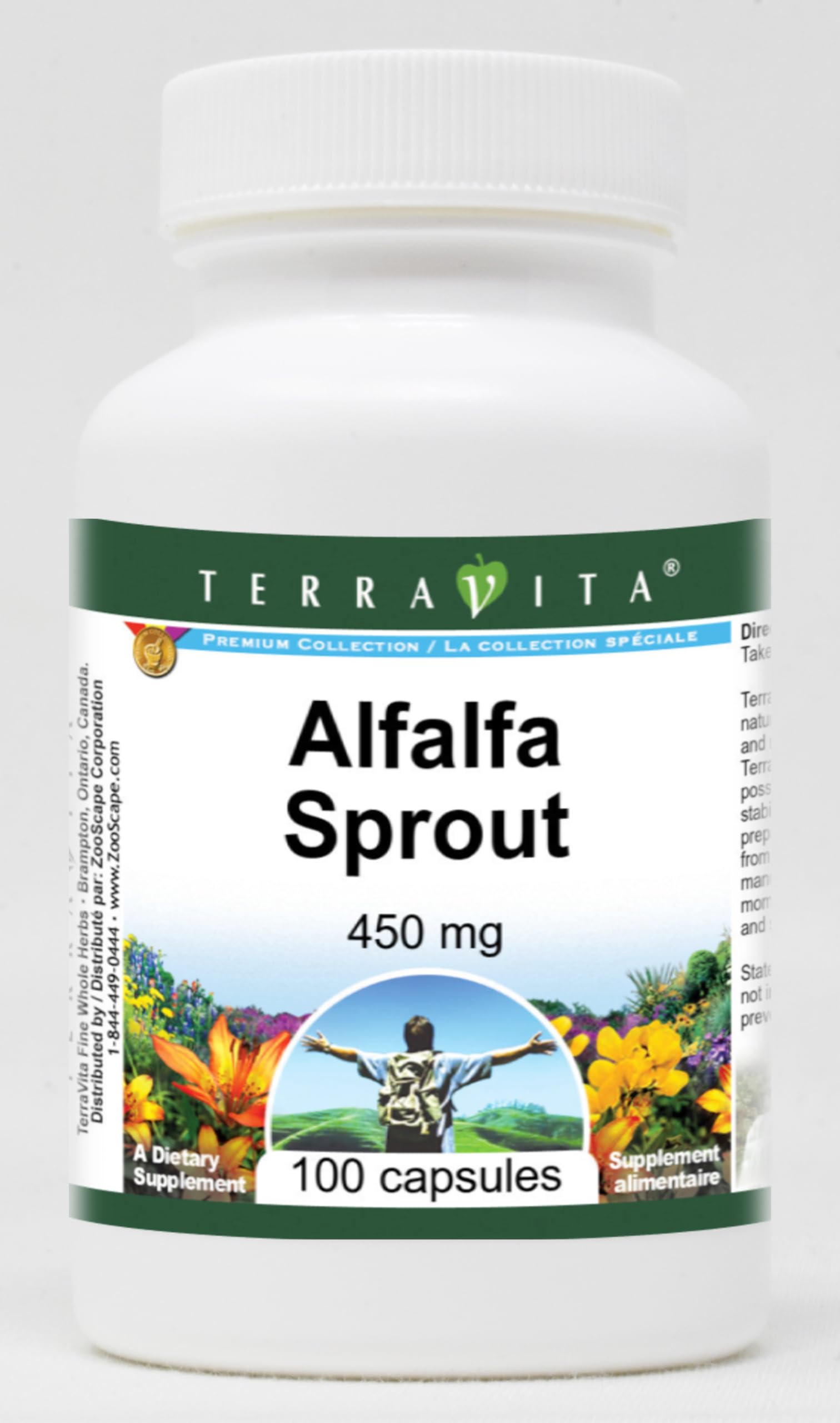 Alfalfa Sprout - 450 mg (100 capsules, ZIN: 518852) Packaged in the United States in a GMP certified facility (Good Manufacturing Practice). No fillers. Manufacturer: TerraVita Size: 100 capsules Easy-to-swallow Capsules in a sealed bottle. Ingredients: Gelatin, Water, Alfalfa Sprout - 450 mg