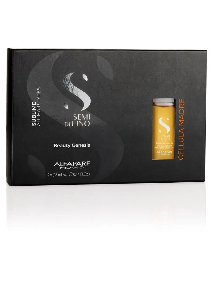 Sublime Beauty Genesis Ampoules (12 ampoules, 13 ml each) ALFAPARF 17776, which restores hair strength, contain unique argan tree stem cells, vitamin F, flaxseed oil extract, and a UV filter. This argan-based restoration unlocks your hair's full beauty potential. Directions: Mix with Semi di Lino Beauty Multipliers injections in a 1:2 ratio. Exclusive to beauty salons. COMPOSITION: Ingredients Alcohol Denat., Undeceth-3, Propylene Glycol, Aqua (Water), Cetyl Alcohol, Lauryl Alcohol, Cetrimonium Chloride, Behentrimonium Chloride, Myristyl Alcohol, Parfum (Fragrance), Isopropyl Alcohol, Polysorbate 20, Ethylhexyl Methoxycinnamate, Linalool, Benzyl Salicylate, Ethoxydiglycol, Linseed Acid, Limonene, Coumarin, Citronellol, Linum Usitatissimum (Linseed) Seed Extract, Citral, Alpha-Isomethyl Ionone, Isomalt, Ci 19140 (Yellow 5), Phenoxyethanol, Ci 16035 (Red 40), Ci 15985 (Yellow 6), Argania Spinosa Sprout Cell Extract, Lecithin, Ci 42090 (Blue 1), Ethylhexylglycerin, Sodium Benzoate, Biosaccharide Gum-4